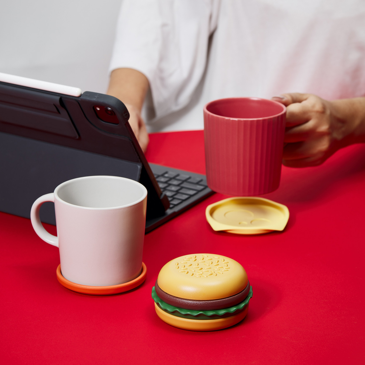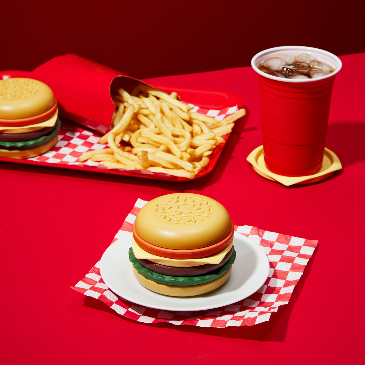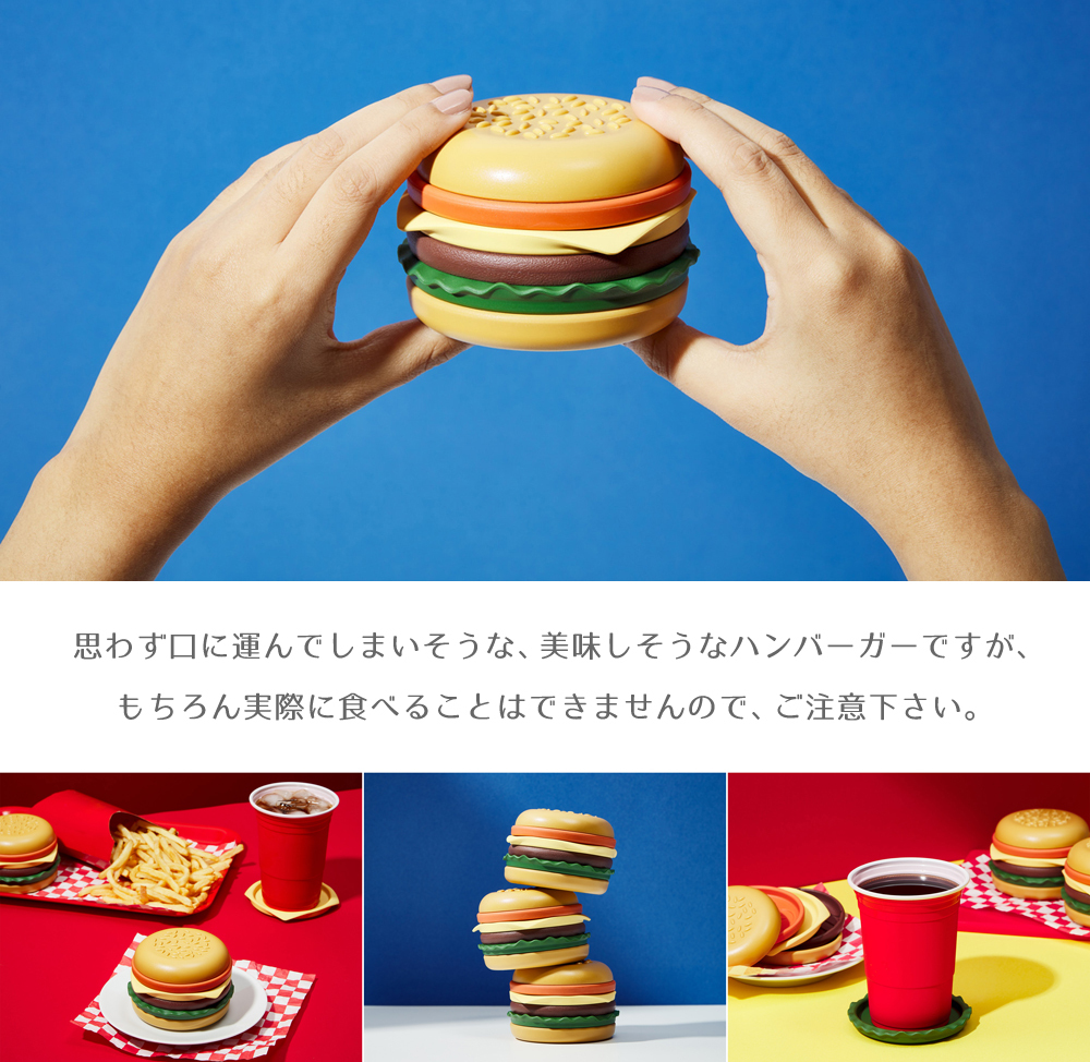 | 商品説明 | "The Burger Coaster"は、一見すると美味しそうなハンバーガーに見えますが、チーズなどのそれぞれのパーツをコースターとして利用できる、ユニークなキッチン雑貨です。 バンズ、トマト、チーズ、ミート(パティ)、レタスという、ハンバーガーの定番の組み合わせで、普段は重ねてハンバーガー型のオブジェとして。食事の際はチーズやレタスなど、お好きなパーツを取り出してコースターとして。 いざ使うとなると、どれを使うか悩んでしまいそうですね。 |