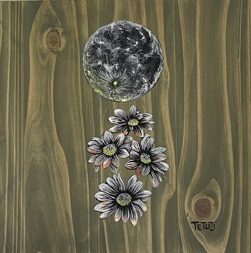 幻想的な月光の下で咲くデイジーを描いた真作「The moon daisy」。25cm x 25cmの杉の板に顔彩で施されたこの作品は、月の光に照らされたデイジーが美しく、その存在感を際立たせています。優しい色合いと精緻な描写が、見る人の心を穏やかにし、温かな感動をもたらす特別な一枚です。