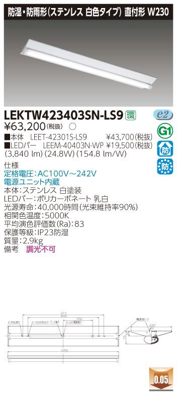 LEDベースライト 防湿・防雨形 一般タイプ4000lm LEKTW423403SN-LS9