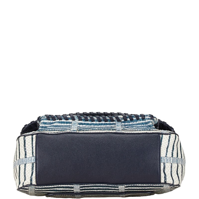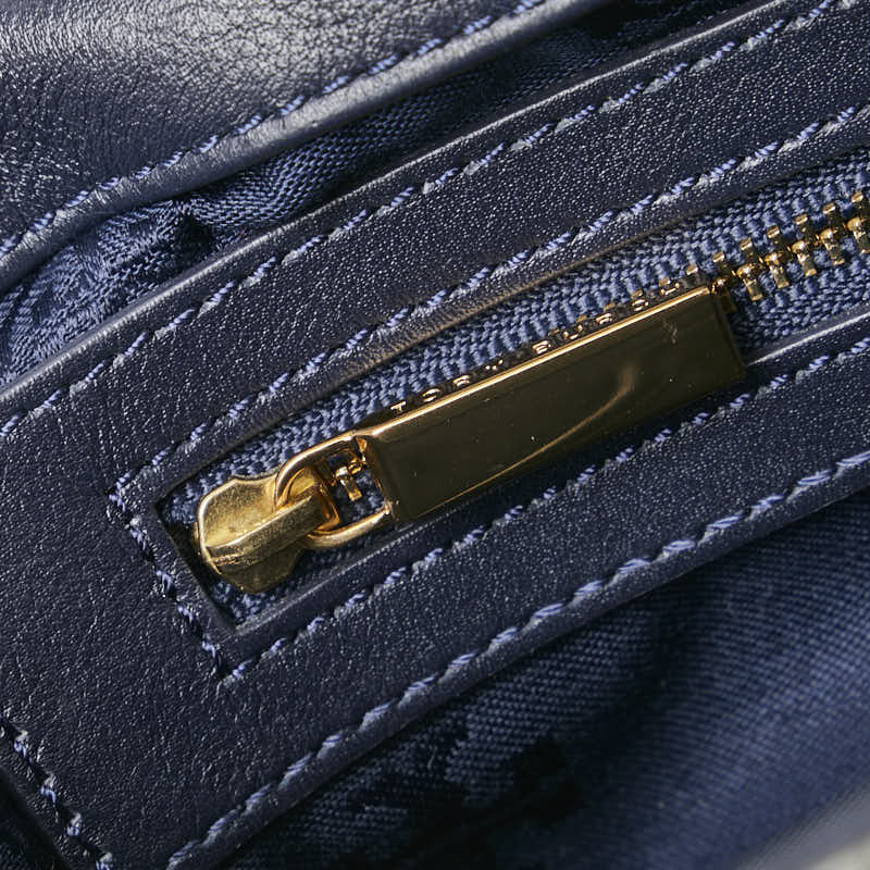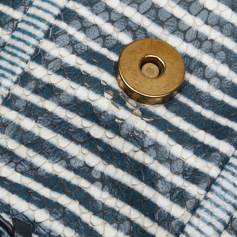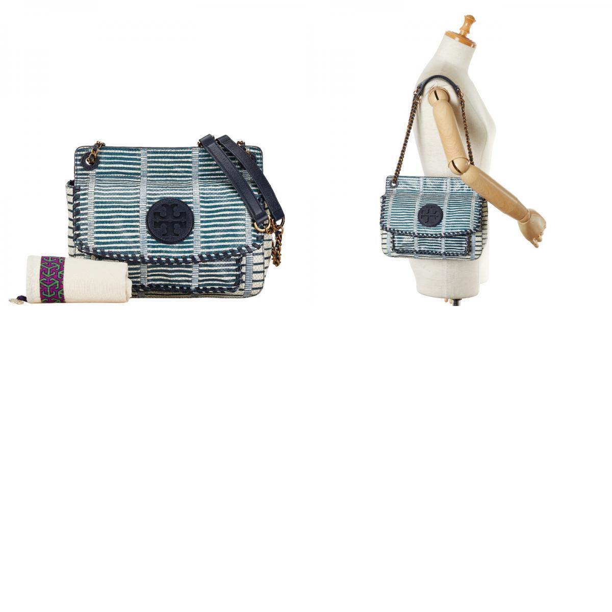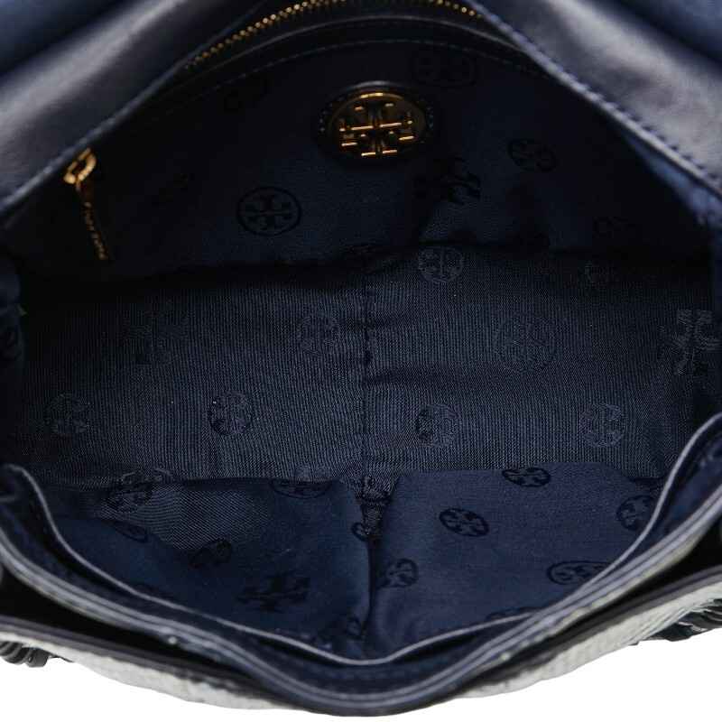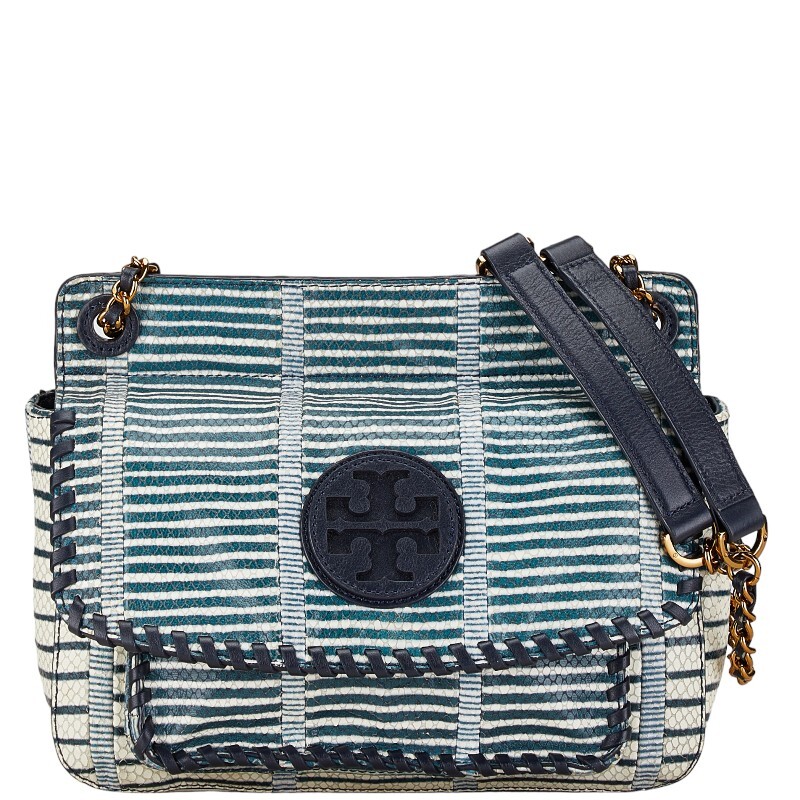 トリーバーチ パイソン型押し ボーダー チェーン ショルダーバッグ ネイビー ホワイト レザー レディース Tory Burch 【中古】