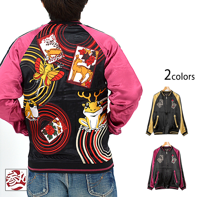 「参丸一」さんから「花札猪鹿蝶」総刺繍リバーシブルスカジャン(SM-30612)のご紹介です。 花札で遊んでいたら突然近くの蛙たちの様子が!? また、今回のスカジャンはリバーシブルになっています。 ボディーにはレーヨンサテンを採用。 1枚持っているだけでずっと使えるアイテムです。 | ||||||||||||||||||||
