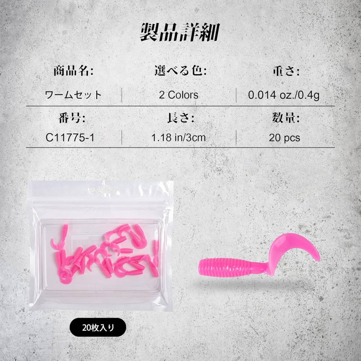 ワームセットは20枚入りで、長さ約3cm、重さ0.4g、カラーはピンクです。