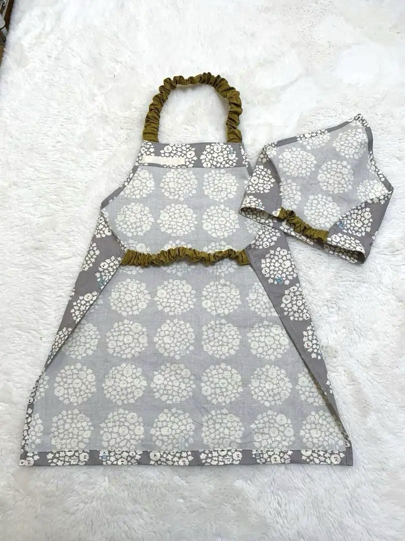 首・腰部分がゴム使用になっていて、お子様でも一人で着られるエプロンセットです。
