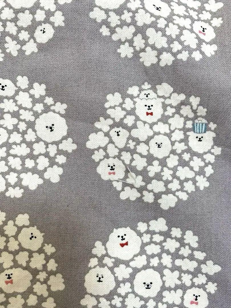 生地はキャンバス地、北欧調 ポップコーンドック(プードル)・フラワー・グレー×白花