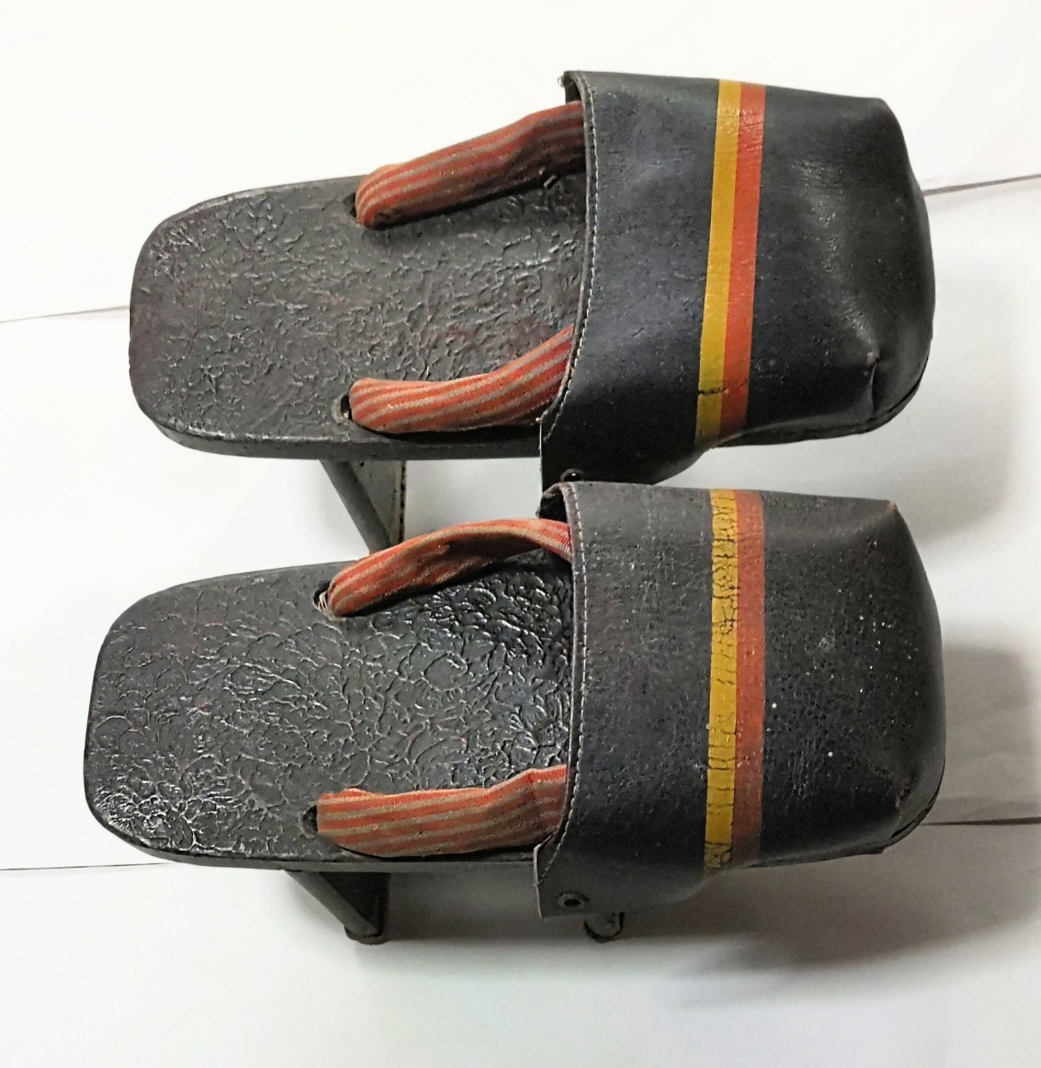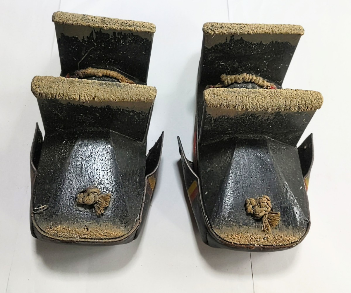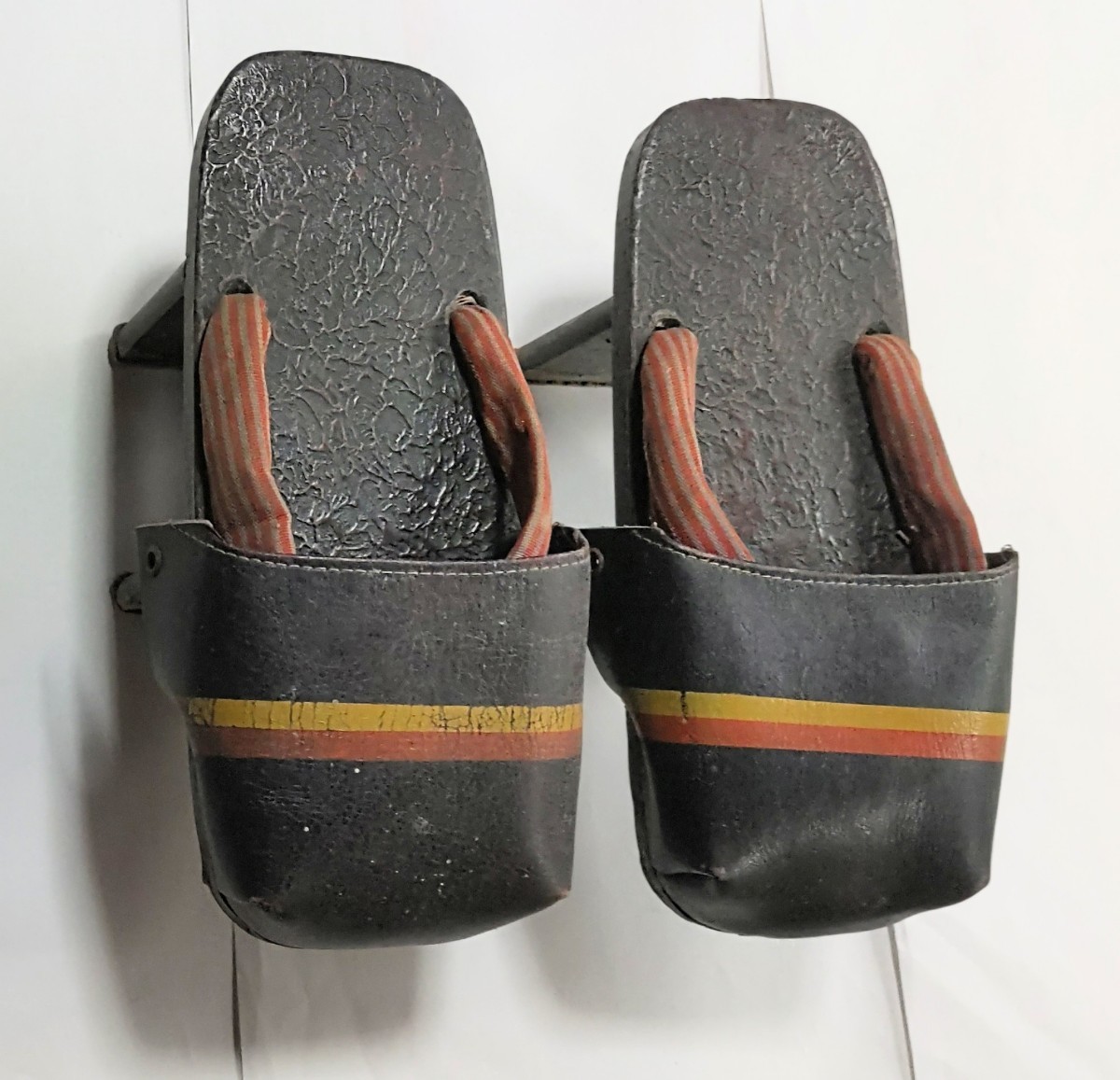 昭和時代に使用していた雨下駄です。全体的に状態が悪く、汚れや傷みがあります。歯の部分はちびています。