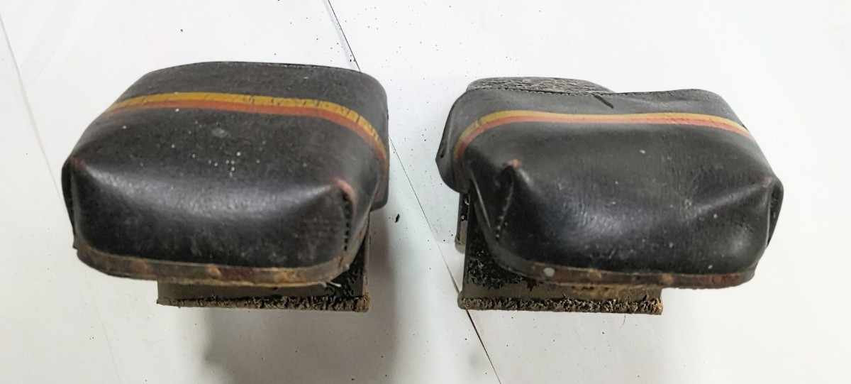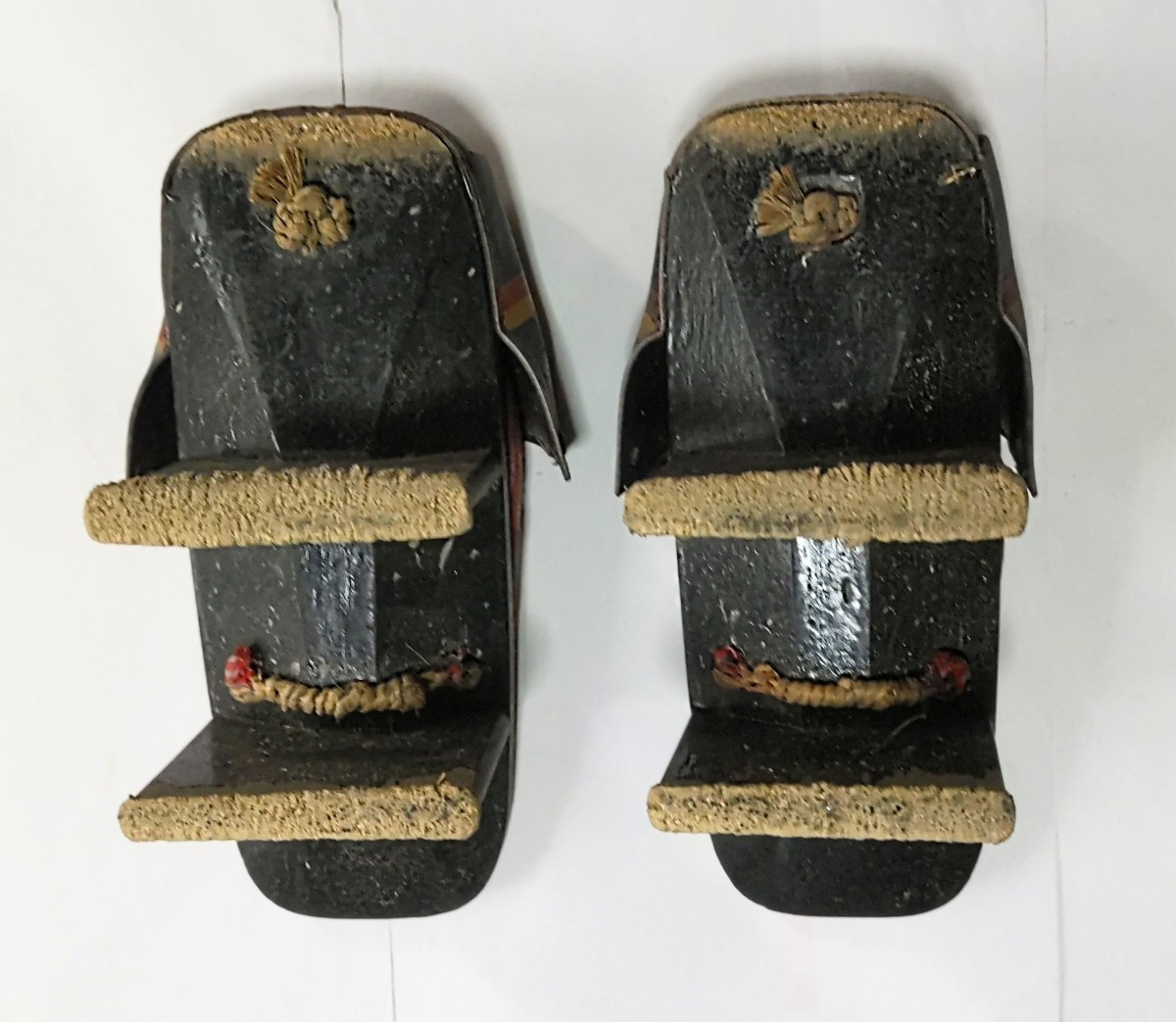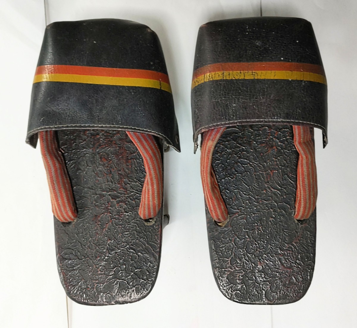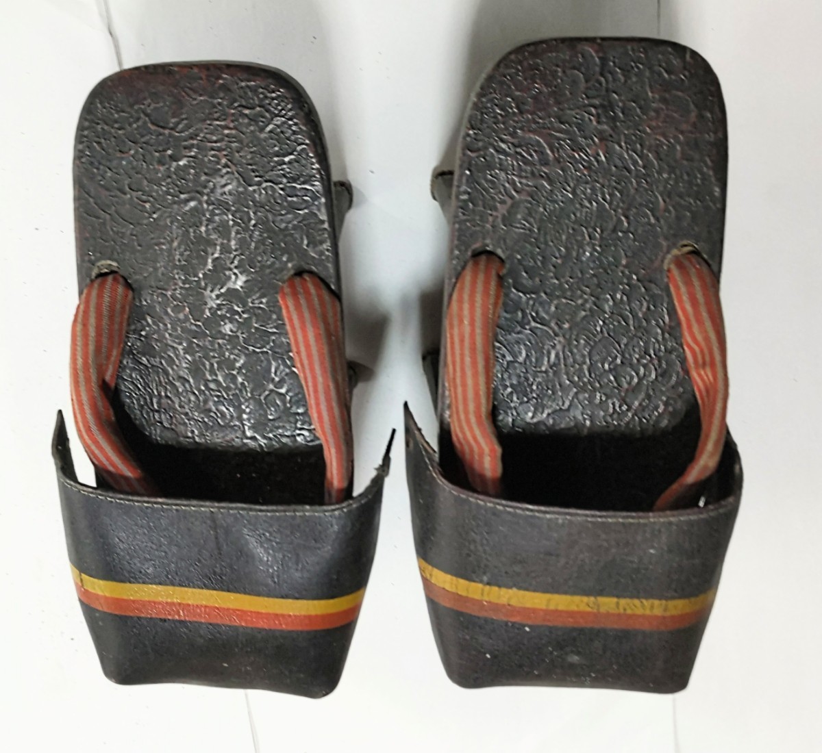 昭和時代に使用していた雨下駄です。全体的に状態が悪く、汚れや傷みがあります。歯の部分はちびています。
