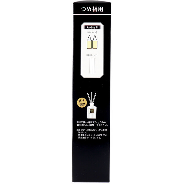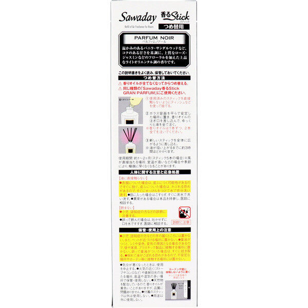 | 上質な香りを広い空間に、大きめサイズ。 濃密フレグランスオイルを使用した香水調の香りが、スティックを通してお部屋全体に広がります。 ●パルファム・ノアール 高級感のあるライトオリエンタル調の香り。 温かみのあるバニラ・サンダルウッドなど、コクのある甘さを基調に、上質なローズ・ジャスミンなどのフローラルを加えた上品なライトオリエンタル調の香りです。 ●詰替用です。 個装サイズ:65X235X50mm 個装重量:約175g 内容量:140mL 製造国:日本 【品名】 芳香剤 【セット内容】 香りオイル、黒スティック 【用途】 室内用 【成分】 香料、溶剤 【つめ替方法】 ※香りオイルが全てなくなってからつめ替える。 (1)使用済みのスティックを直接触らないようにティッシュなどを使って捨てる。 (2)ガラス容器を平らで安定した場所に置き、香りオイルの注ぎ口を差し込んで、ゆっくりと液を全て注ぐ。 ※香りオイルは1本ずつ、2本全てを注いでください。 (3)新しいスティックを全体に広がるように差し込む。 ※液が吸い上がるまでに約3時間ほどかかります。 ※香りオイルがなくなったら、同じ種類の「Sawaday 香るStick グランパルファム つめ替用」をお使いください。 ★香り調整 香りが強いときはスティックの本数を減らし、調整してください。 ※液を吸い上げたスティックに直接触らない。触る場合はティッシュなどを使い直接触らないようにする。 【使用期間】 約1~2ヶ月(スティック5本の場合) ※風が直接当たる場所、室温が高いなどの場合や季節により、極端に早くなくなることがあります。 【注意】 ・小児、認知症の方などの手の届くところには置かない。また、ペットが近づける場所に置かない。 ・薬液がつくと、シミや変色、変形の原因となる場合があるので、壁や家具、プラスチック製品に接触する場所に置かない。誤って薬液がついた場合は、すぐに拭き取る。 ・倒れて液がこぼれる恐れがあるので、不安定な場所やカーテン等に接触する場所には置かない。 ・気分が悪くなったときは、使用を中止する。 ・火気の近く(ストーブやコンロなど)や直射日光の当たる場所、高温や湿気の多い場所で保管・使用しない。 ・天然物を配合しているので、香りオイルが黄色いことがありますが、品質に問題ありません。 ・付属のスティック以外は使用しない。 ・用途以外に使用しない。 ※火気厳禁 第二石油類 危険等級3 パラフィン含有物 140mL 注意事項 予告なく成分・パッケージが変更になることがございます。予めご了承ください。 *予告なく成分・パッケージが変更になることがございます。予めご了承ください *ダンボールを使用して発送する場合には、入数以下の個数の場合、 中古ダンボールを使用する場合があり、ご注文の商品とは異なるダンボールになる場合があります。 あらかじめ、ご了承ください。 |