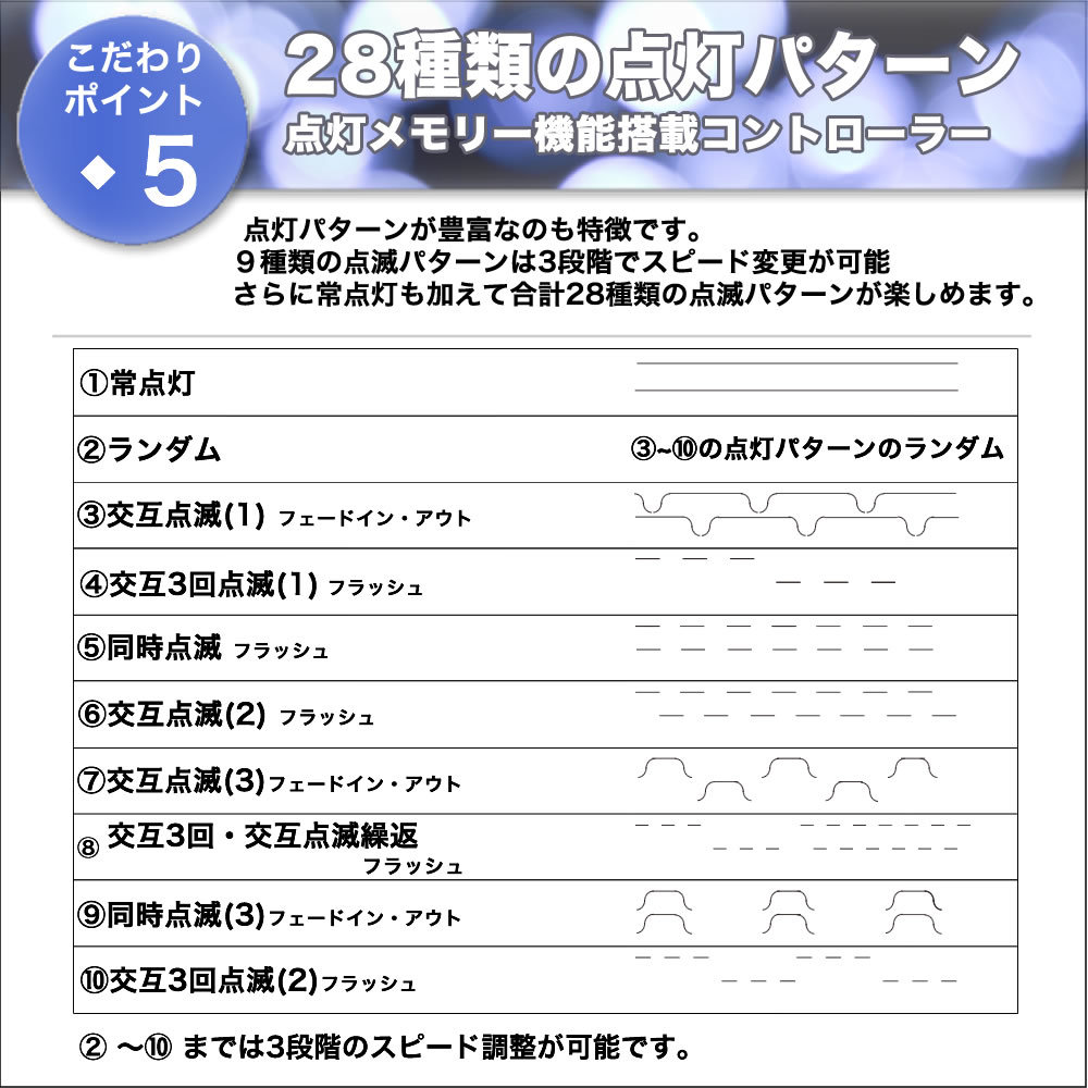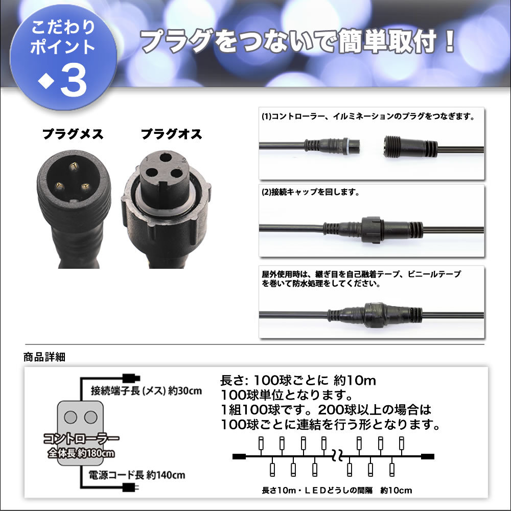 | ストレート ライト ハイスペックタイプ 200球 20m ホワイト・白 点滅 28種類 Bコントローラセット ![]() 最近は、LEDイルミネーションも各社が販売しており、 会社はもちろん、自宅等にもイルミネーションを飾り付けするケースも増えてきました。 イルミネーションで、木、庭、クリスマスツリー 等をライトアップでき、明るく印象を変える事ができます。 最近は、価格安いイルミネーションも増えていますが、 品質面に不安を感じた事はありませんか? 「防水性能がしっかりしておらず壊れた…」 「コントローラーの作りが簡素で不安」 等々で、失敗されたお客様、 品質にこだわったイルミネーションを使ってみませんか? 当社のイルミネーションは、購入してから 安心してお使い頂く為に、 とにかく品質面にこだわった商品です。 こだわりのポイントをご紹介いたします。 ![]() ![]() ![]() ![]() ![]() ![]()