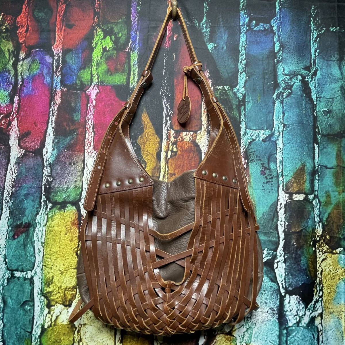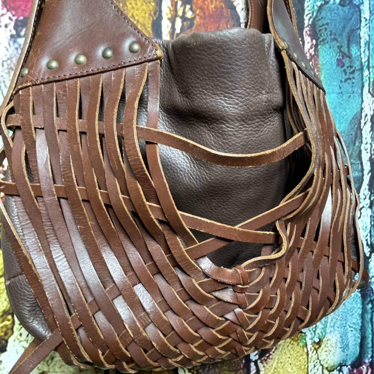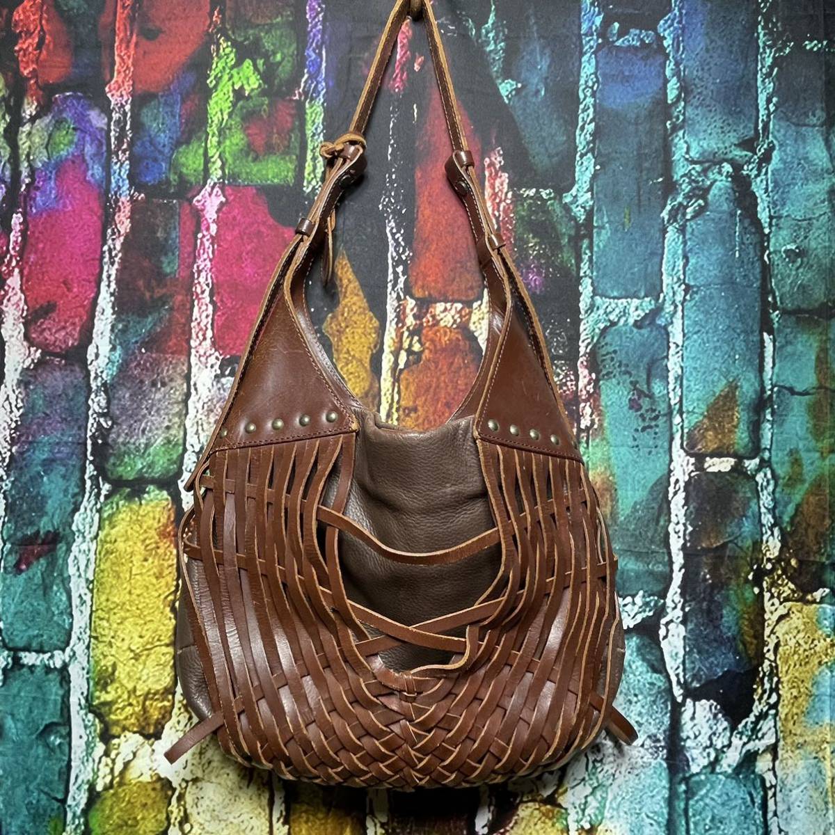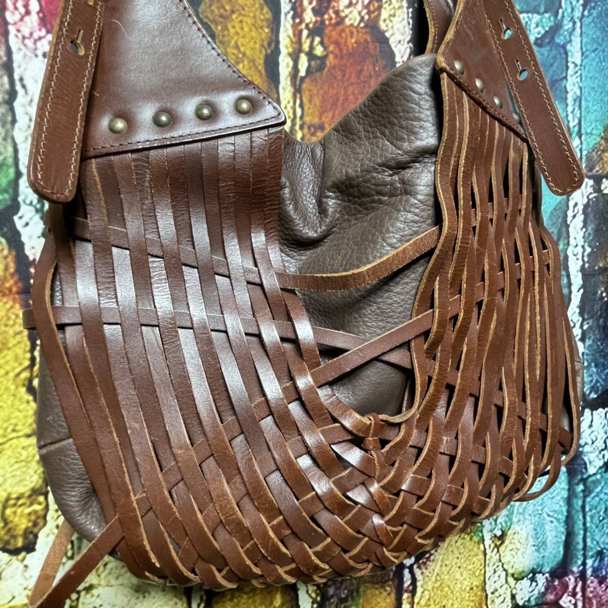 特徴的な編み込みフロント: バッグの前面には、緻密で芸術的なレザーの編み込みデザインが施されており、視覚的な面白さと手触りの良い質感が魅力です。このユニークなディテールが、他のバッグとは一線を画しています。