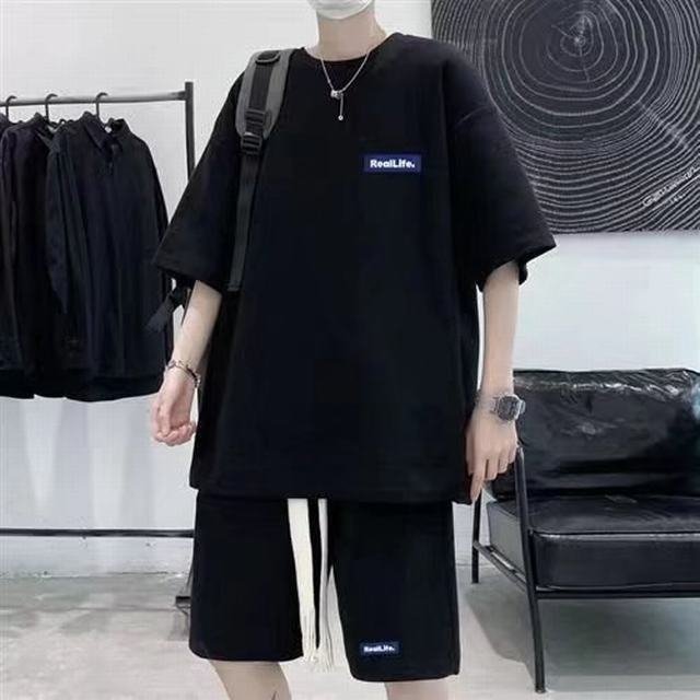 夏 カジュアル 半袖シャツ ショートパンツ 韓國ファッション セットアップ 上下セット メンズ ブラック M