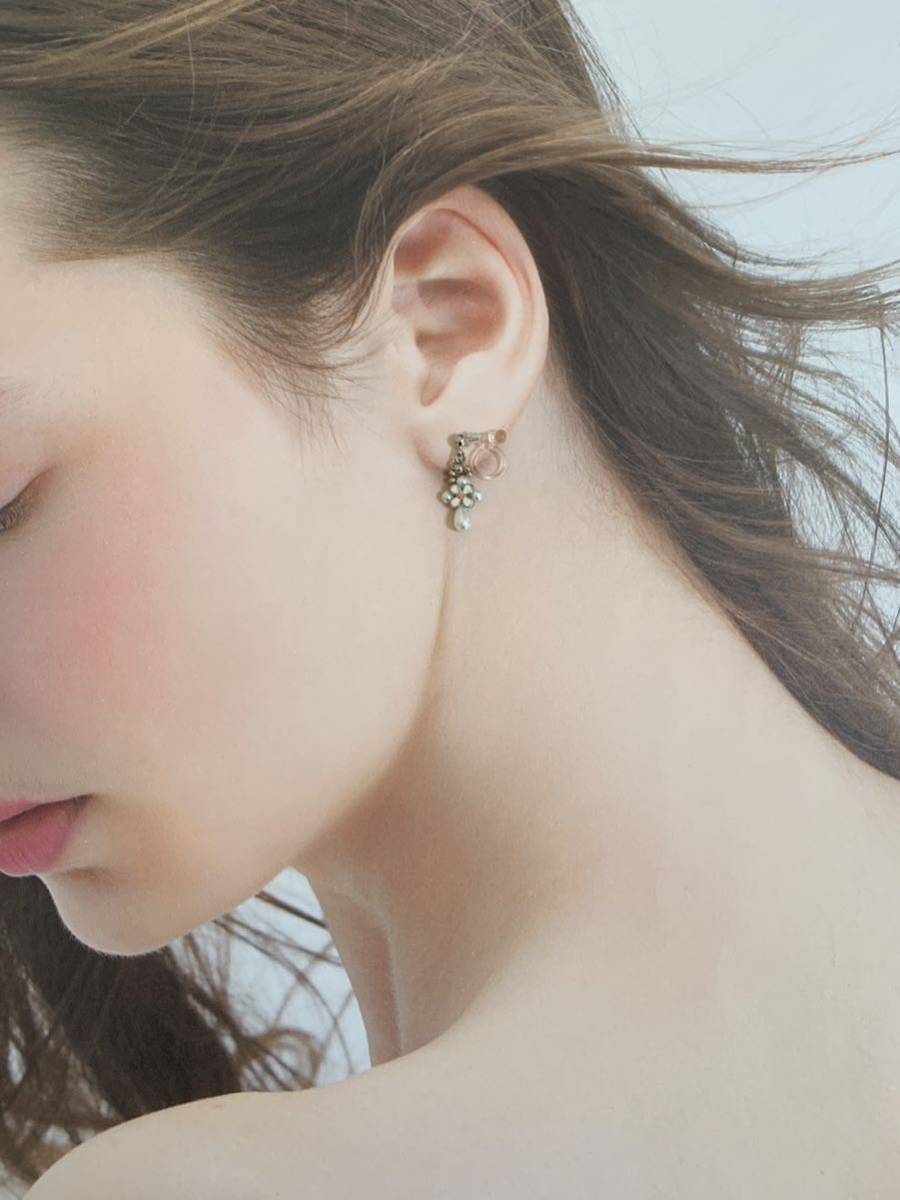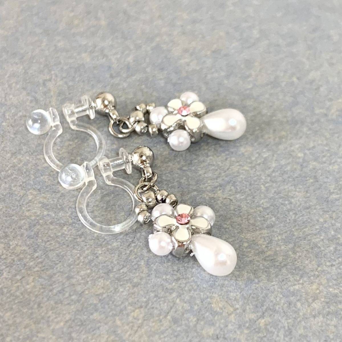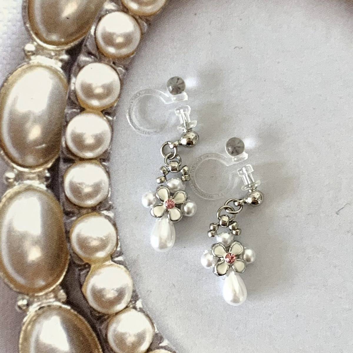 フラワーのメタルパーツがアクセント。ピンクのラインストーンがキラリと輝くプチピアスです。こちらはノンホールピアスになります。