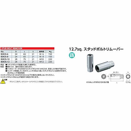 適用径:M8・シルバー 適用径:8mm BSR35-8・・Style:適用径:M8・メーカー品番:BSR35-8・差込角:1/2.(12.7mm)・全長:65・差込外径(六角):21・適用径:M8、重量:150g商品の説明 KTC 12.7sq.スタッドボルトリムーバー BSR358-2285 【3835570】 より ●スタッドボルトの脱着に