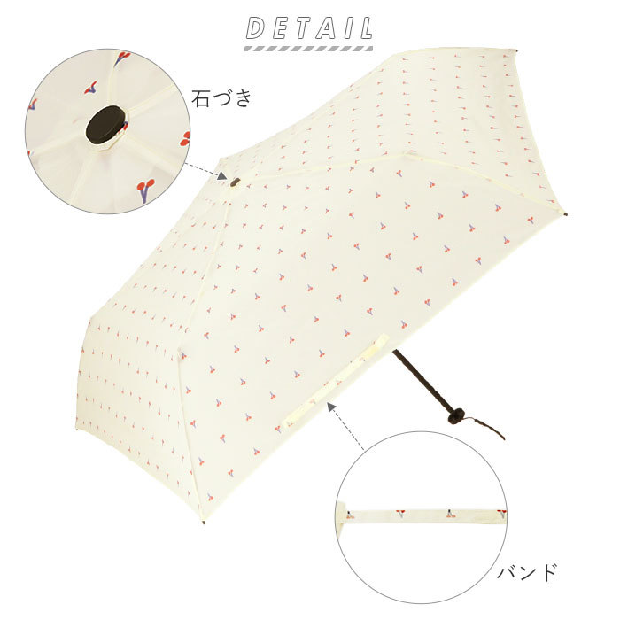 | 注意点 | ※※傘生地は濃色のプリント色が淡色部分に色移りする移行昇華という現象が現れることがございます。現在の染色技術では完全に防ぐことはできませんのでご了承ください。 ※製品には尖った部分があります。常に周囲の安全を確認し開閉時は傘を顔や体から離して開閉してください。 ※傘を開く際は生地を十分にほぐしてからゆっくりと開いてください。 ※手元や骨、または傘の先端が壊れたまま使用しないでください。 ※ステッキがわりに使用したり振り回したり、投げたりしないでください。 ※傘は必ず手で持ってご使用ください。 ※ハンドクリームや日焼け止めクリーム等が、生地・手元の色落ちの原因になる場合があります。 ※強風の時は破損の恐れがありますので使用しないでください。 ※傘の生地は色落ちする場合もありますので、乾燥不十分なまま衣服やその他の物への接触は避けてください。 ※ご使用後は陰干しして十分に乾燥させてから次回ご使用ください。ご使用後濡れたまま放置すると防水はっ水力の低下や骨の劣化につながります。 ※ご使用後は、直射日光や高温多湿の場所を避けて保管してください。 ※傘生地には防水はっ水加工を施し、縫製にははっ水糸を使用していますが、激しい雨や長時間のご使用では雨が染み込むことがございます。また、飾り加工部分(刺繍、ステッチ、バイピング等)は、デザインの特性上完全な防水はっ水加工が難しい場合があり雨が染みやすいのでご注意ください。 ※降水量が20mm以上の場合、ある程度使用されますと漏水の恐れがありますのでご注意ください。 ※傘生地の防水はっ水力は、ご使用頻度に比例して低下してくることは避けられません。長くご使用いただくには、市販の防水スプレー等でケアして頂くことをお勧めします。 ※お子様には保護者の方からご注意ください。 ※カメラやモニターの性質により、画像と実物の色の違いがある場合がございますのでご理解願います。 |