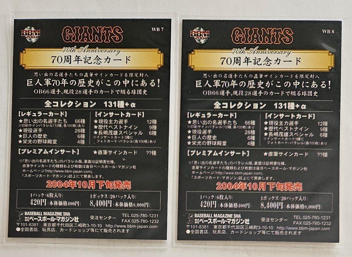 2004年BBM 巨人70周年 週刊ベースボールプロモーションカード2枚セット 堀内恒夫、高橋由伸 ジャイアンツ