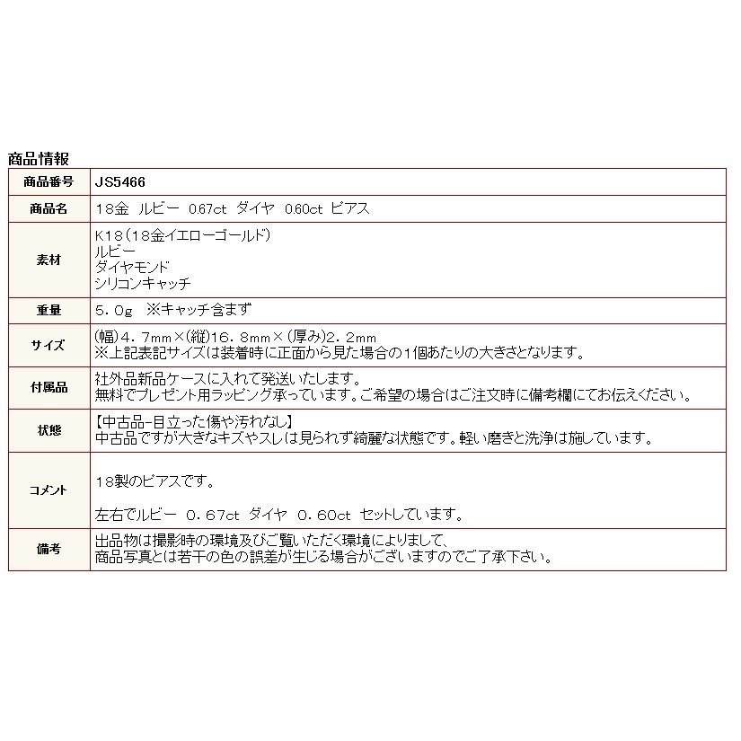 | 素材 | K18(18金イエローゴールド) ルビー ダイヤモンド シリコンキャッチ |