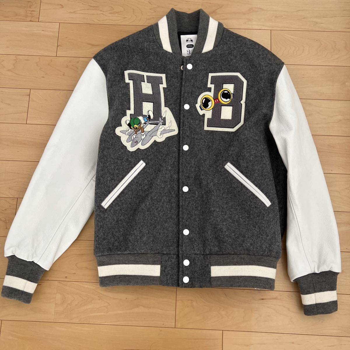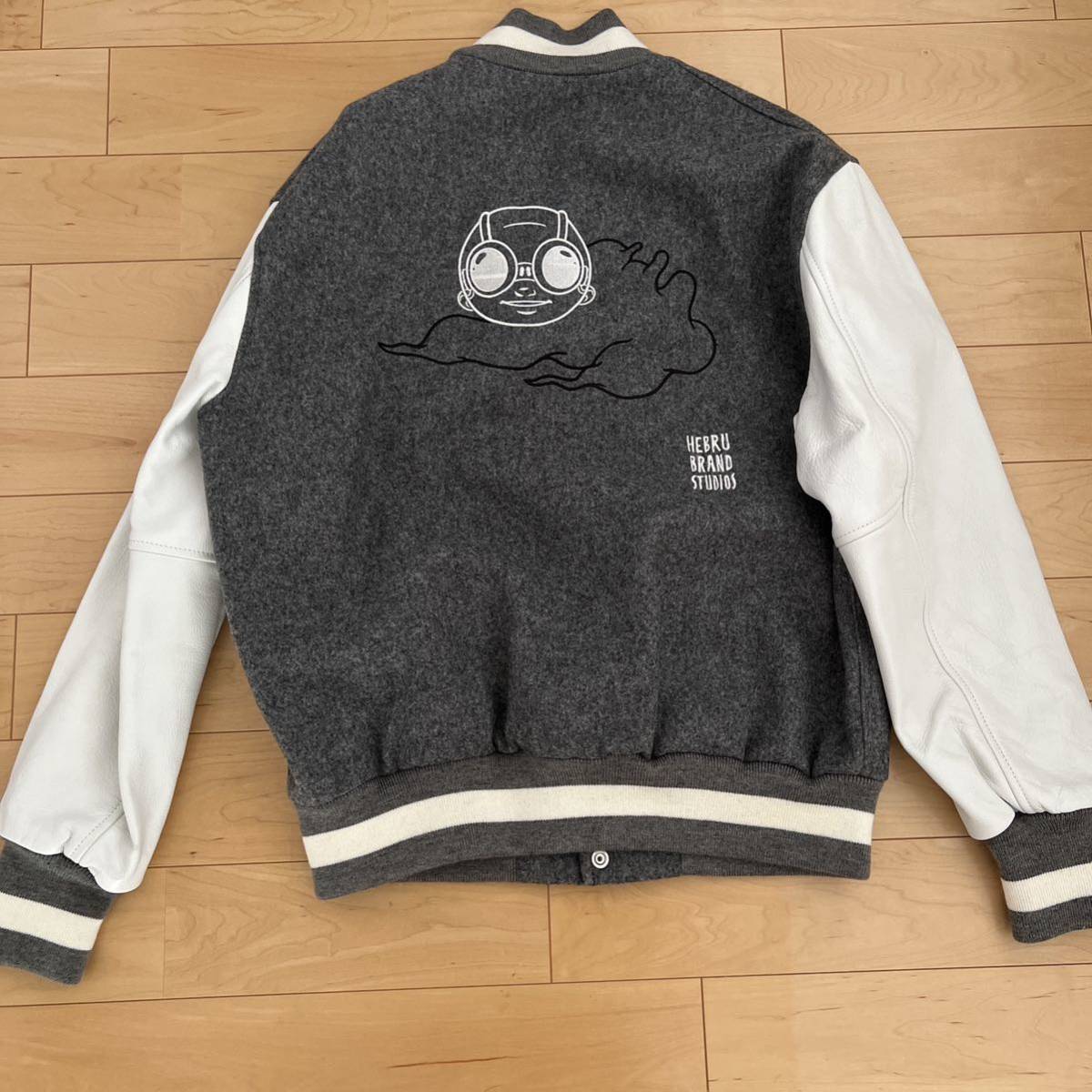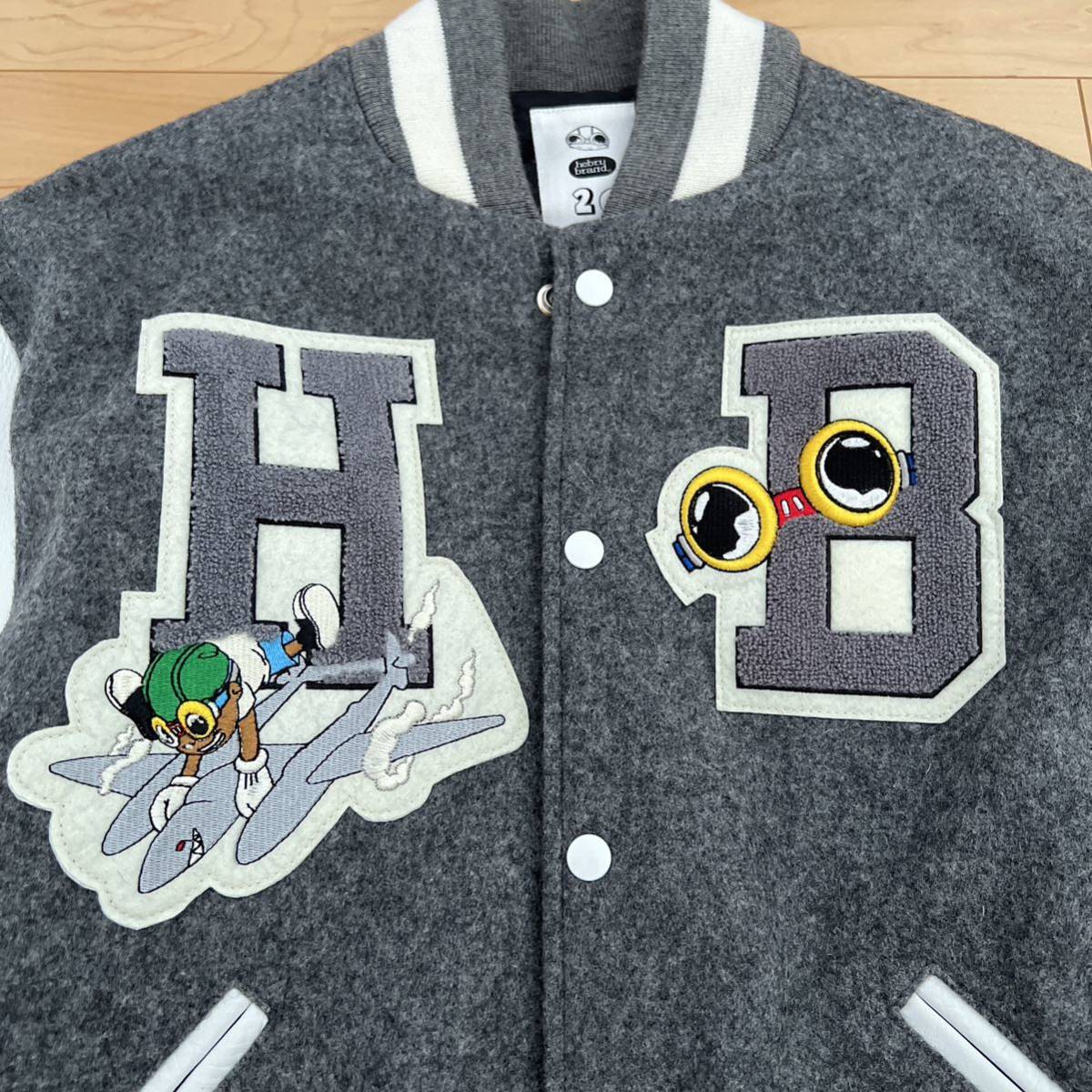 Hebru Brantleyによるアートをワッペンや刺繍で落とし込んだバーシティージャケット。Hebru Brantleyのアートを刺繍で精巧に表現するため、生産背景にこだわった一着。ボディーはアメリカの老舗ブランドSKOOKUM製で、胴部分はウール、袖部分はレザーを使用している。
