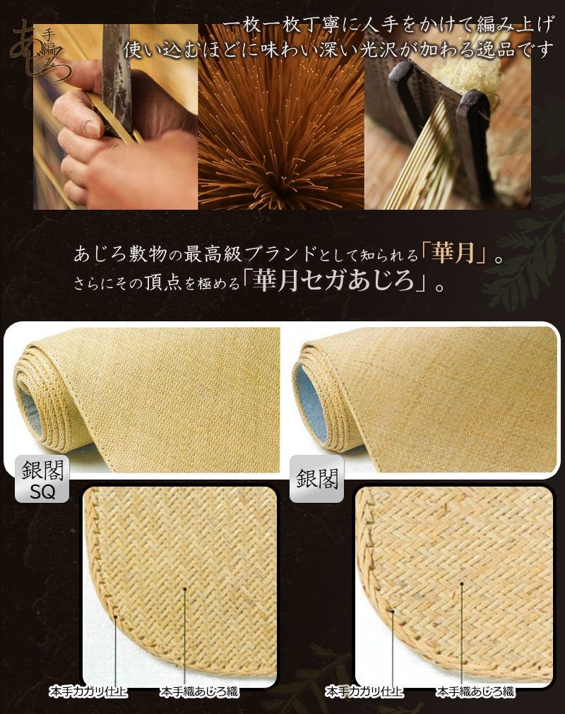 籐敷物 華月 本物志向の方に華月セガ籐あじろ銀閣軽くて柔らかく、ひんやり 職人による精巧な手編み 籐あじろ 希少で高価な天然素材である籐を使った敷物、華月。その触感はひんやりとしており、特に素足での感触は心地よく、高温多湿の日本にはぴったりと言えます。 華月は厳選された籐の皮材をあじろ編みして、さらに変形しないよう裏打ちを施し仕上げています。 ラインナップの中には、八女の伝統工芸である手すき和紙に防虫、防臭効果のある渋柿をしみこませた渋柿和紙を裏張り加工した籐あじろカーペットもあり、いずれも職人技ならではの精緻な作りを実現しております。 ![]() ![]() 華月セガ藤あじろ「銀閣SQ」高地でとれる質の高いセガ藤の中から、より高品質な材料のみを選別したものを使用しています。表面のホーロー質(象牙質)はより厚く、またピール(藤表皮)は従来の銀閣に比べ、厚みを薄く加工していますので、踏み心地もいっそう快適です。 ![]() 華月の特長●籐の表皮のみを使用、あじろ編みは手作業で行っています。●素材の特性を生かして、軽い上に強くてしなやかな風合いがあります。 ●繊細な編み模様とナチュラルな色合いは和室だけなく洋室にも合います。 ●使い続けると色が飴色に変わっていく経年変化の味わいが楽しめます。 ●カーペット、座布団、クッション、マット、シーツと多彩なラインナップをご用意。 触れると手触りが優しい 爽やかな夏のしつらいに 風格漂う最高の感性品 経年変化のあじわい深い風合いをお楽しみください。 ![]() 華月セガ藤あじろ銀閣表面/セガ藤表皮100%、ピール幅:約2.1mm裏面/不織布+綿布貼り マットは裏滑り止め加工 ※藤商品は天然素材(伸縮)のため、多少サイズが異なります。 ※天然素材のため、および印刷インキの都合上、実物と色が異なる場合がございます。 華月セガ藤あじろ銀閣SQ 価格表(税別) 単位cm