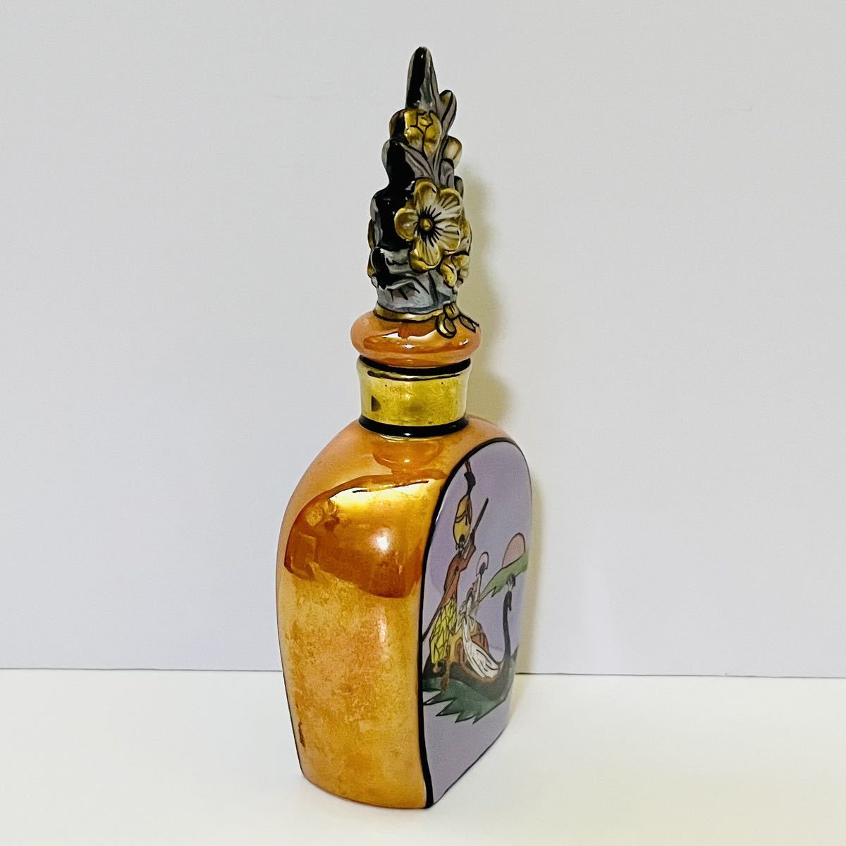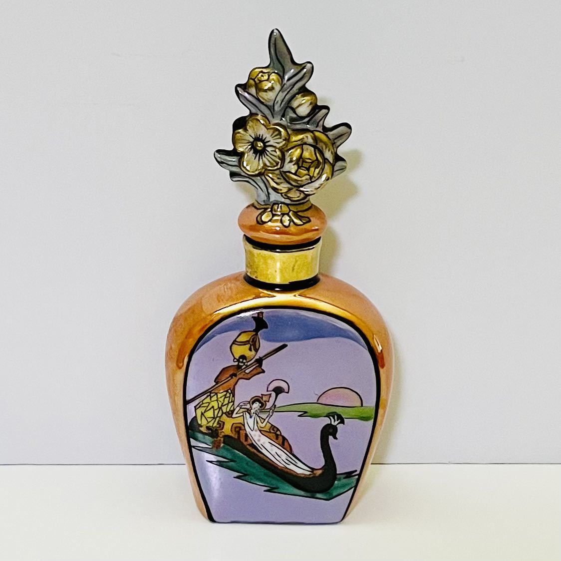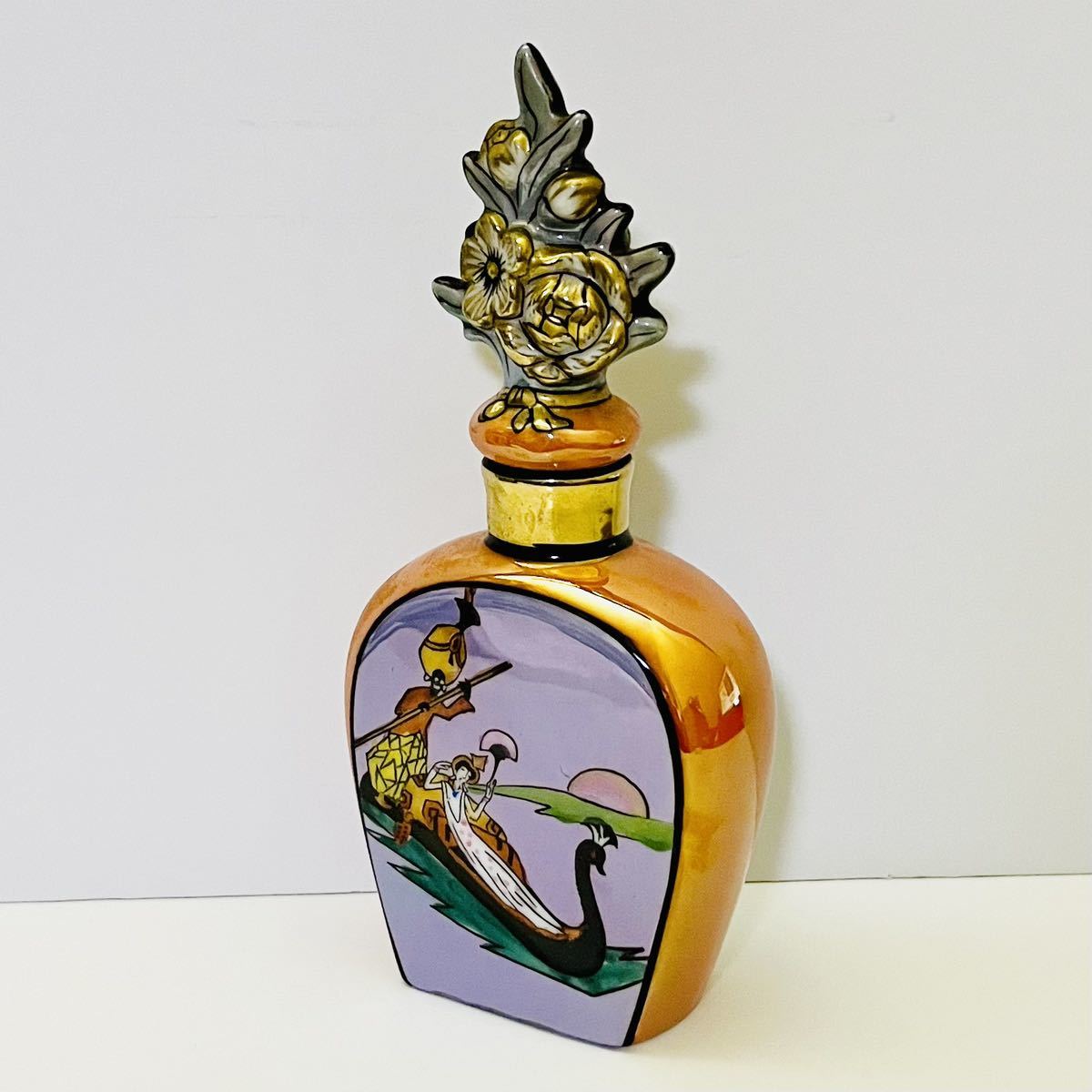 オールドノリタケのデコレディの香水瓶です。 香水瓶は、ラスター彩と金彩が美しく施されて、ゴンドラに乗っているレコレディが描かれています。 バックスタンプのM-JAPAN印から推定すると1918〜1941年頃にかけて、主にアメリカ向けに輸出品として製造されたものです。 アメリカ本国でも熱狂的なコレクターズアイテムとして愛されているため、この商品は非常に希少だと言えます。 【サイズ】 横幅6cm、奥行3cm、高さ14cm 【状態】 約100年前のアンティーク・ヴィンテージ品になりますが、目立った傷、欠け、割れ、修復跡はなく、とても綺麗な状態です。 わずかな擦れ、傷等は記載しない場合があります。 写真をじっくりご確認いただき、気になる点がございましたら、どうぞお気軽にお問い合わせください。 |