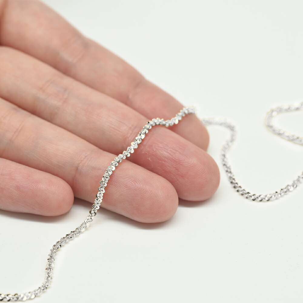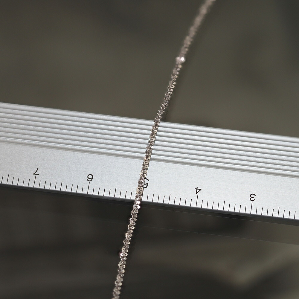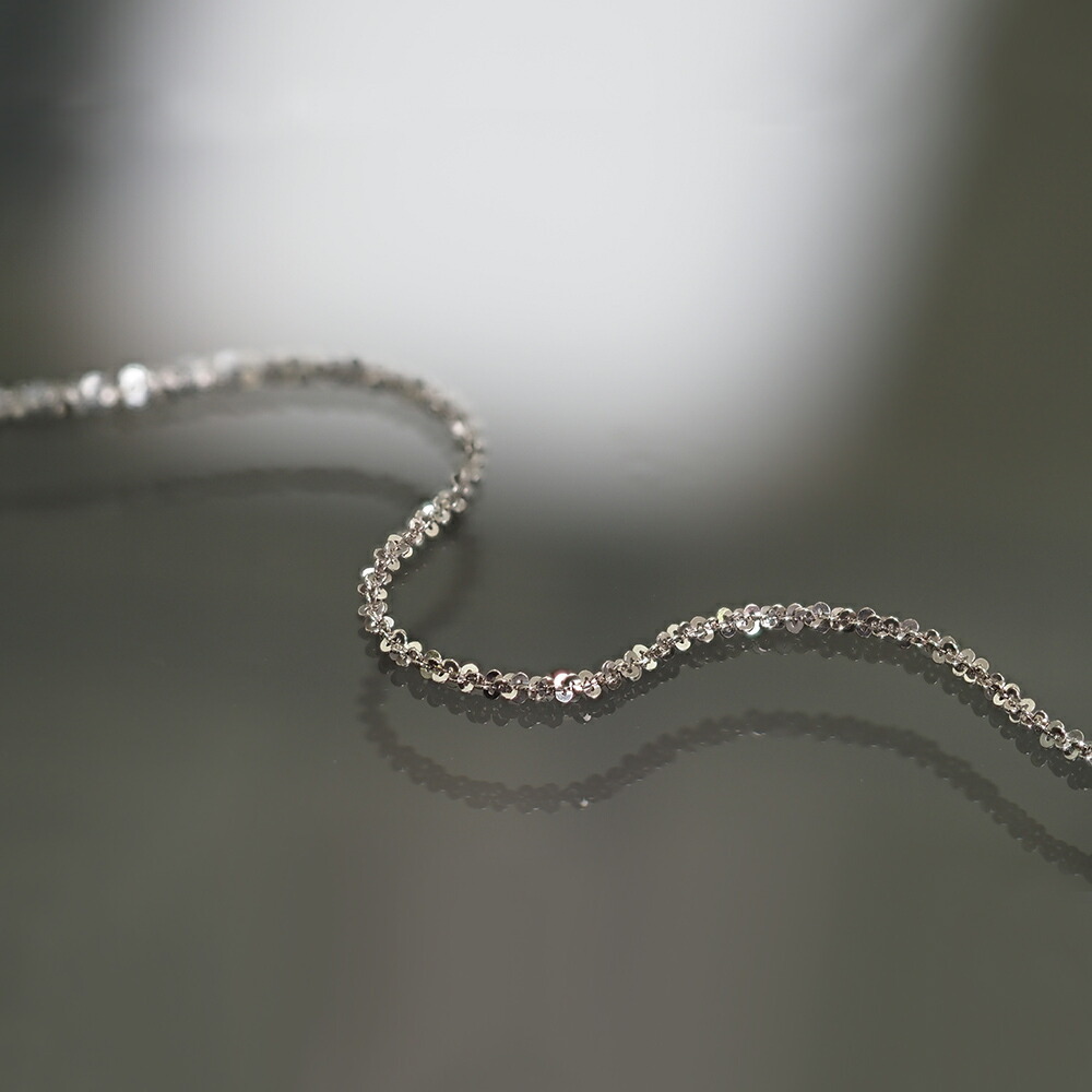 小豆タイプのコマにひねりが加わることで360°どこから見ても繊細な輝きを放つチェーン。どのようなファッションにも合わせやすく、オフの日はもちろん、気分を上げたい日のデイリーコーデにもぴったりです。小さな花を並べたようなきめ細やかなチェーンパーツのひとつひとつにキラキラと光が咲いて、袖口や襟元から見え隠れするたびに心が躍ります。![]() ※ホワイトゴールド製品につきまして |