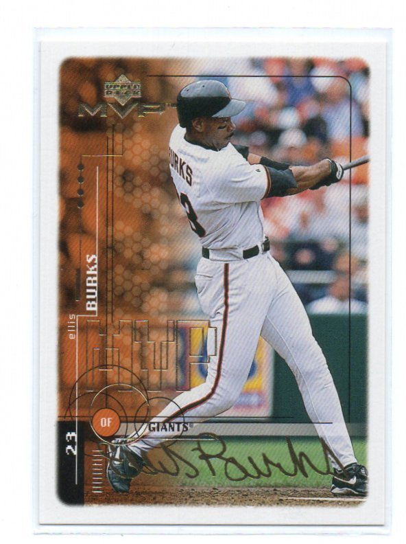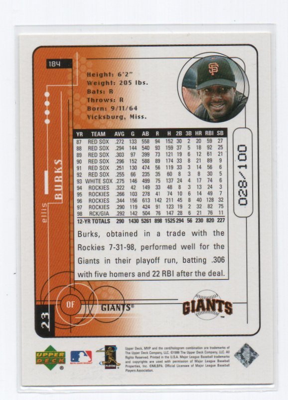 1999 Upper Deck MVP MLB、カードNo.184「ELLIS BURKS」選手の100枚限定、ゴールド・スクリプト・箔押しサイン・パラレルカードです、シリアルナンバーは028/100、状態良好。