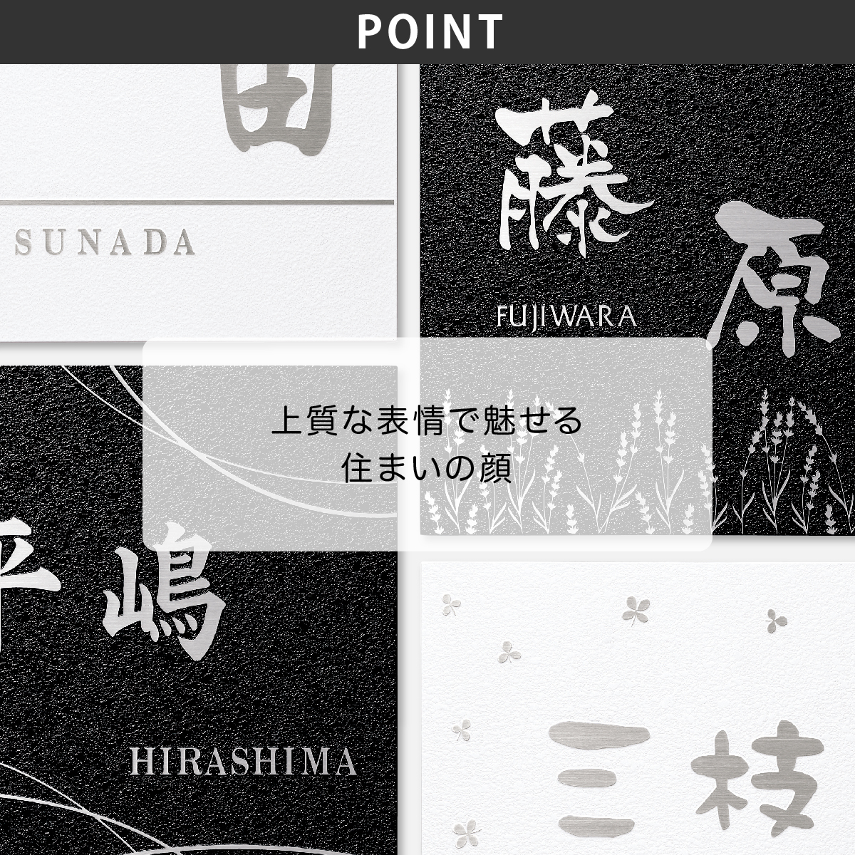 商品詳細 | 黒アクリルにステンレスを重ねた重厚感のある表札です。別寸サイズでのサイズオーダーも可能です。 |