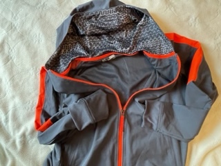 グレーにオレンジの切り替えし、上着はオレンジのフルジップ、フードにオレンジマーク、