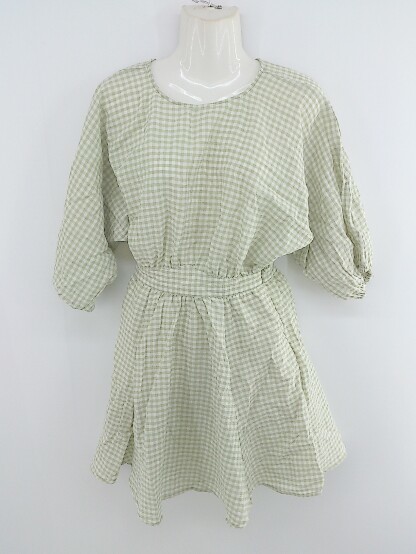 ◇ ◎ H&M エイチアンドエム チェック 七分袖 ミニ ワンピース サイズXS グリーン ホワイト系 レディース P