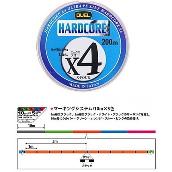DUEL PEライン ハードコアX4 200m0.5号9LB 5色分け スーパーライトジギング イカメタル ティップラン 日本製