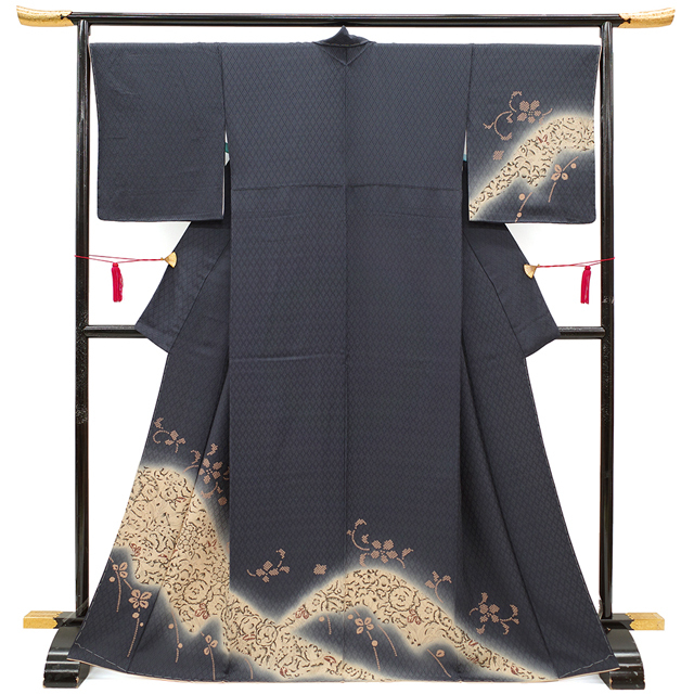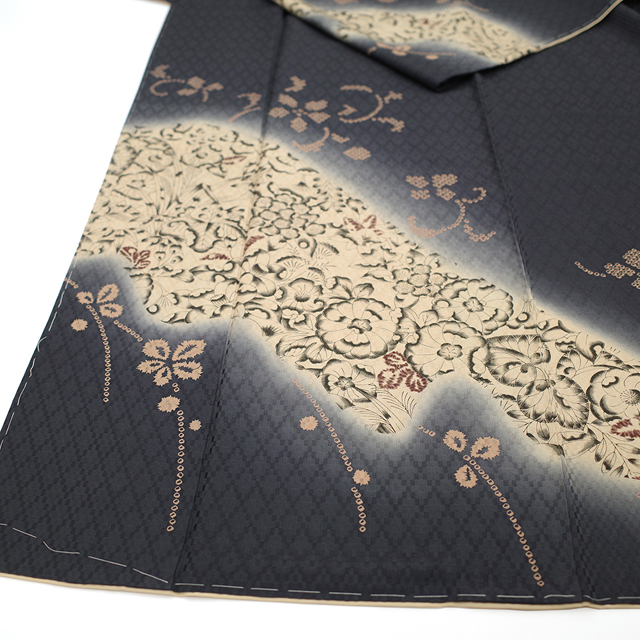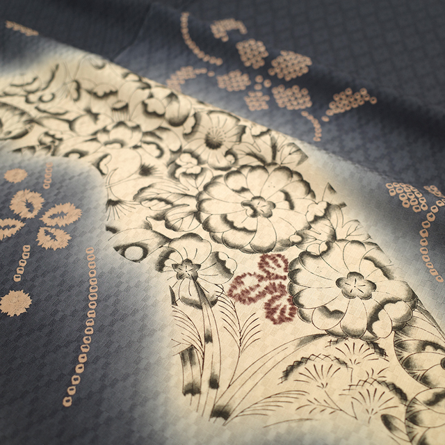 細やかな菱文様も地紋が施された シックな黒グレー地に、辻が花文様が裾と袖に染められています。
