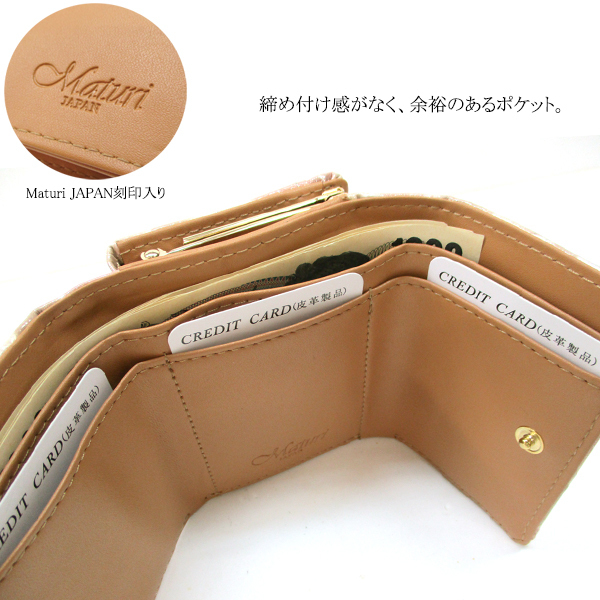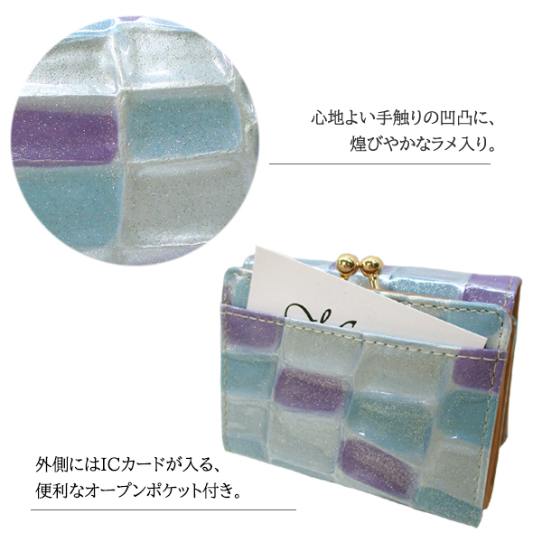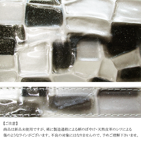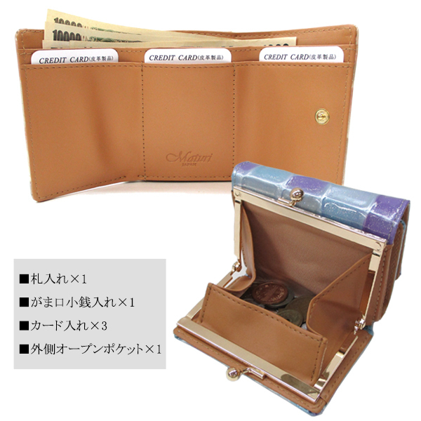 | 心地よい手触りの凹凸に煌びやかなラメが光る、コンパクトなガマ口財布。 表面はエナメル加工で、多少の水滴もサッと拭き取れます。 アピールポイントは広く開くガマ口。 レジ前でも急がずにサッと取り出せます。 お札やカード入れはきつくないように余裕を持たせました。 外側にはICカード等が入るポケットが付いていて便利です。 手のひらサイズなので、トレンドのミニバッグにもスッと入ります。 コンビニやちょっとしたお買い物はポケットIN。 ■カラー:ブルー ■サイズ(約):縦8.5cm×横10cm×マチ4cm (商品によっては誤差が生じます。予めご了承下さい。) ■素材:外側/牛革(クロコ型押しエナメル加工)、内側/ボンテッドレザー ■仕様:スナップボタン開閉、札入れ×1、カードポケット×3、がま口小銭入れ×1、オープンポケット(外側)×1 ■付属:Maturi専用BOX ■新品未使用 ■定価30000円 ※一部共通画像使用 【ご注意】 ※商品によって柄は異なります。柄の指定はできません。 ※新品未使用ですが、稀に製造過程による柄のぼやけ・天然皮革のシワによる傷のようなラインがございます。 細かい傷や汚れについても、不良の対象にはなりませんので、予めご理解下さい。 ※ご覧のモニターやブラウザの設定、照明等により、画像と実物の色合いが若干異なる場合がございます。 これらについては予めご理解頂いた上でご購入下さい。 | |