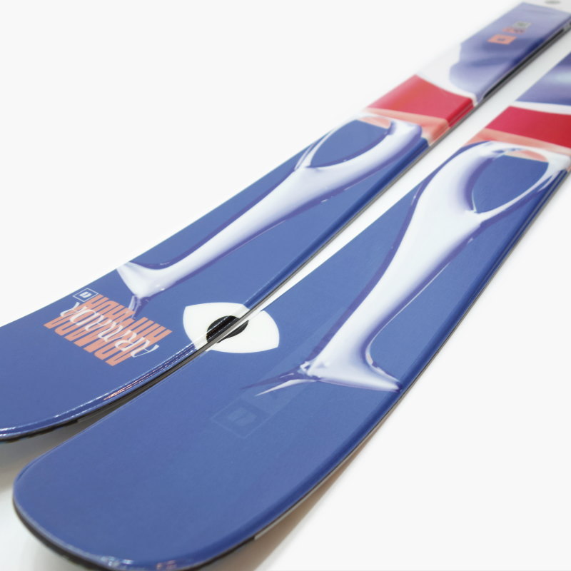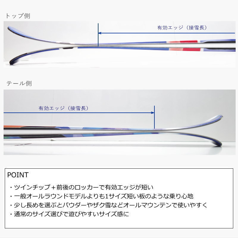 ツインチップ+ロッカーによって有効エッジは一般オールラウンド系のカービングスキーよりも短く設定されていて、同じサイズに乗った場合はより短い板に乗るような感覚で滑ることができます。新雪やパウダーでの浮力を求める場合は1サイズ長め、後ろ向きやグラトリ・パークでは回転が楽になる少し短かめを選ぶのがおすすめのサイズ選びになります。