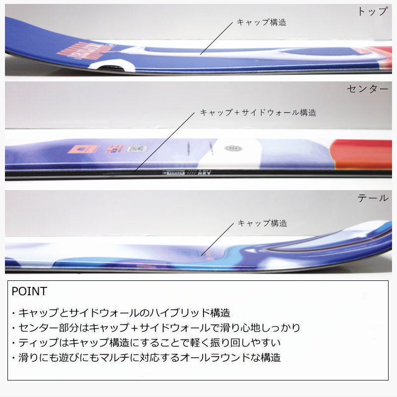 少ない力でも扱いやすく、板のしなりやしっかり感を生むサイドウォール構造とのハイブリッド構造になったことにより、スイングの軽さと安定した滑り心地を兼ね備えるハイパフォーマンスなスキーです。