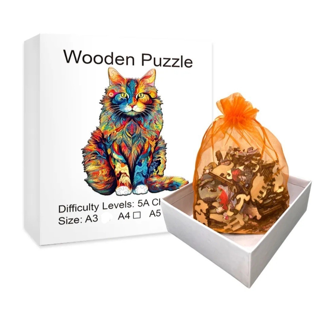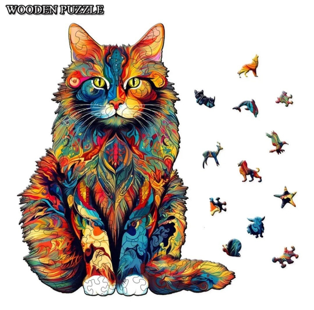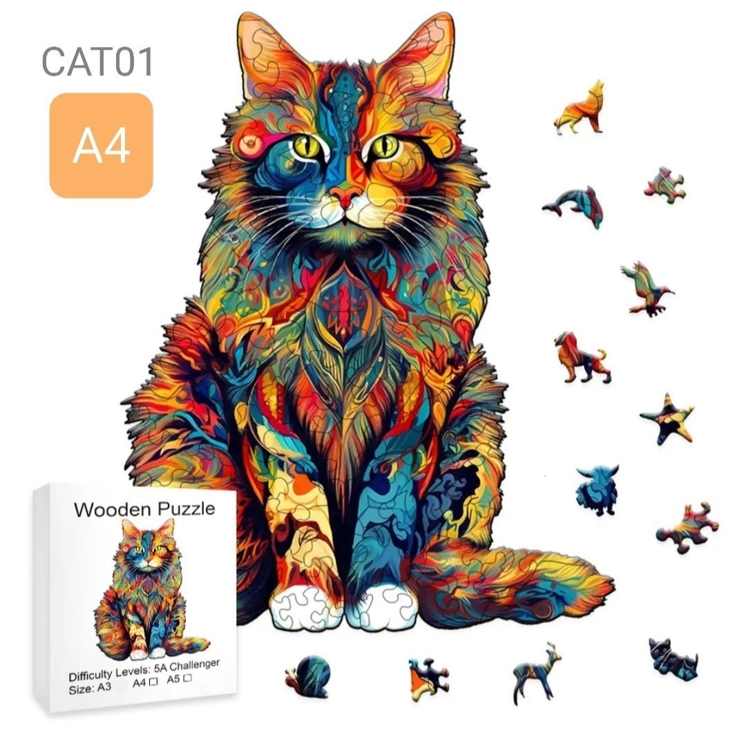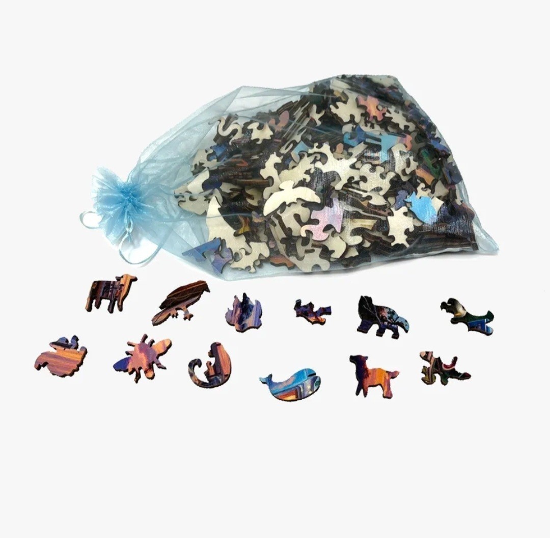 木製のジグソーパズルは、動物や植物のような形をした小さなピースでできています。