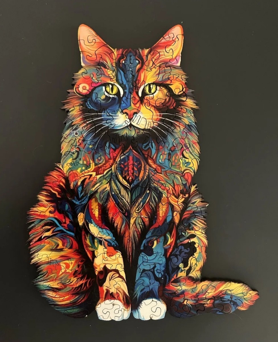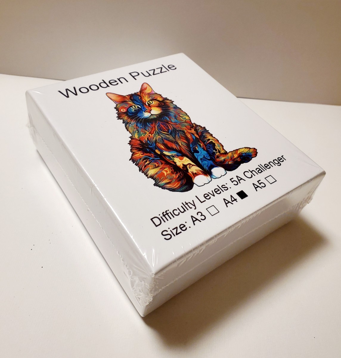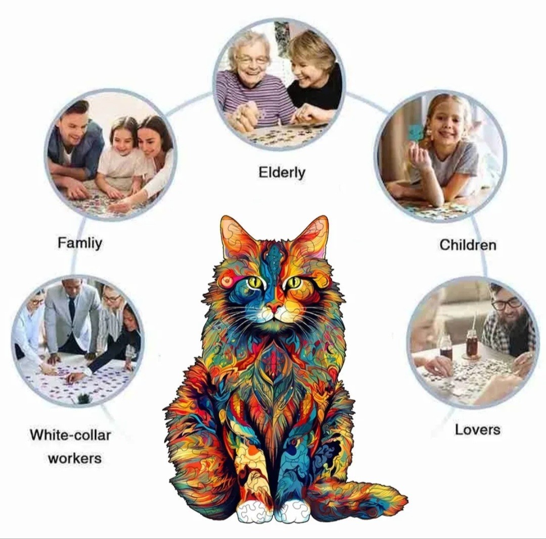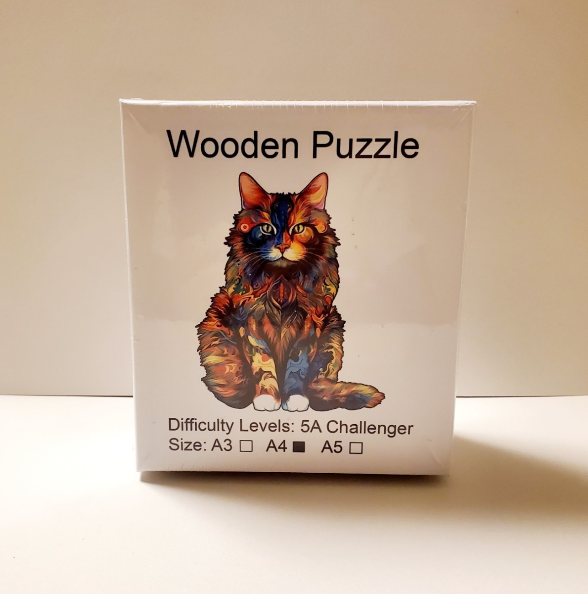 木製のジグソーパズルは、動物や植物のような形をした小さなピースでできています。