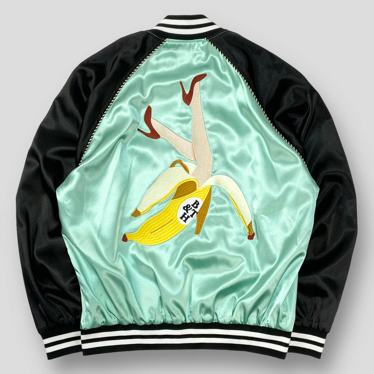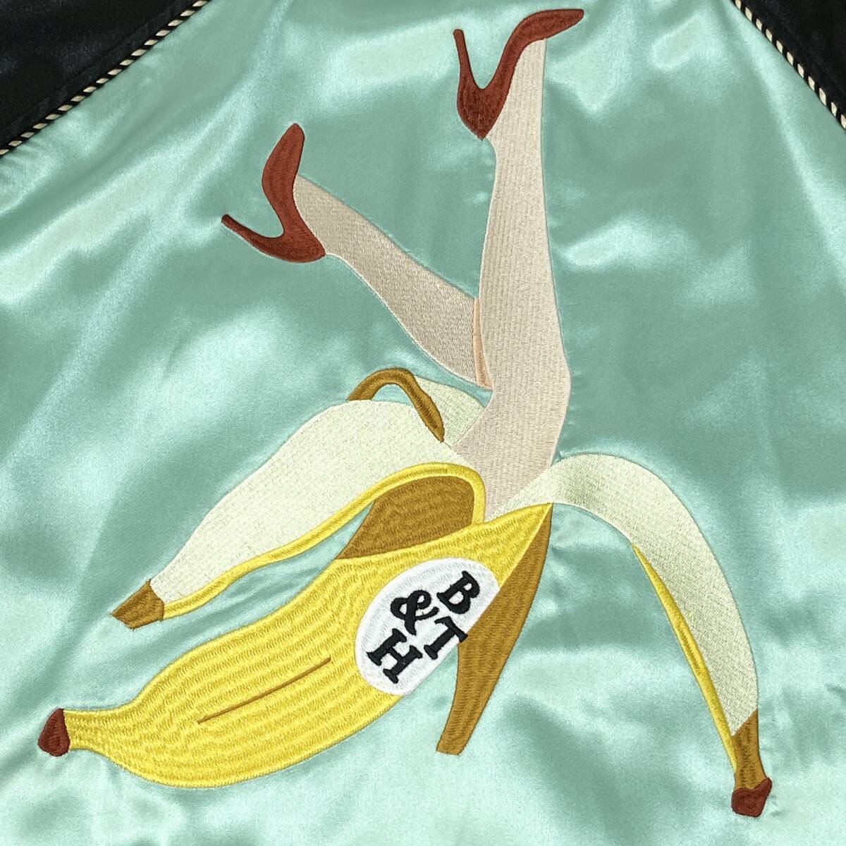 背中に大きくバナナから女性の足が出ているユーモアのあるイラストを刺繍で表現。