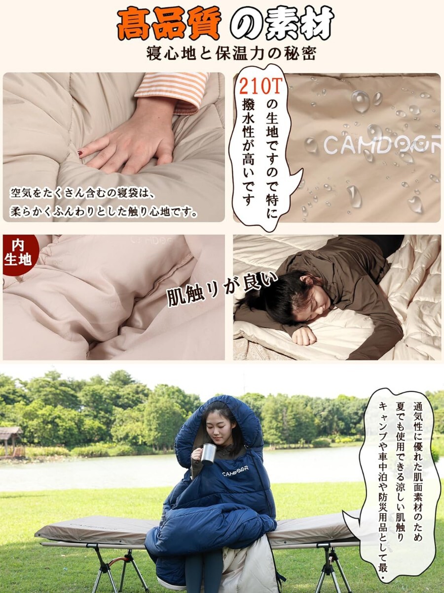 【人工ダウンの保温より】CAMDOORの寝袋動物性成分を100%含まず、環境に優しく再生可能です。人工ダウンは羽毛のように動物性たんぱく質を含まないため羽毛のようないやな動物臭がないのが特徴です。 人工ダウンの繊維構造は羽毛の繊維構造を人工的に再現し保温力と柔らかさ、軽さを実現しました。この素材は家で簡単に洗えて、ダウンと中空綿の長所を組み合わせました。保温性と通気性に優れています。市販されている同じ重さの中綿素材の寝袋よりも暖かくて柔らかいです。外気に邪魔されることなく、安心して眠ることができます。アウトドア、キャンプ、車中泊、登山、旅行、花見、災害などに最適です。動物性素材に敏感なご家族や、お子様もご使用いただけます。