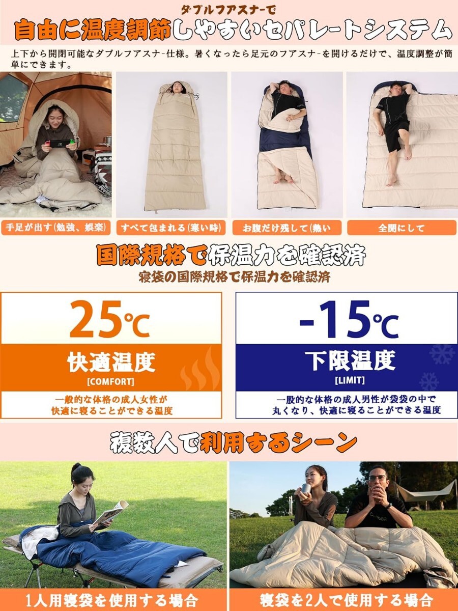 【空間がより広く仕上げました】封筒タイプの寝袋の中にはスペースがあり、その中で手足を伸ばしたり寝返りを打ったりすることができます。帽子は収縮ひもで閉じることができて、暖かさを維持して寒さを防止します。足から肩まで全開になるダブルジッパー仕様で、寝袋を広げてマットレスや布団としても使えます。普通の寝袋よりも幅があって長いのですゆったりとしたサイズで快適な睡眠スペースを提供します。子どもと一緒に使っても十分です。