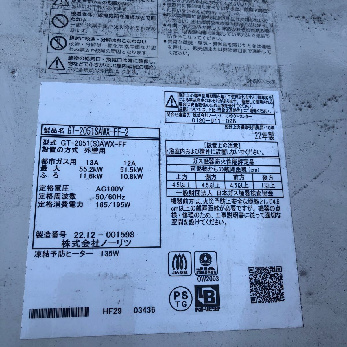 製品名 業務用 ノーリツ ガス給湯器 GT-2051(S)AWX-FF 2022年製 都市ガス12A13A/100V ※リモコンなし W490×D240×H830 店舗用品 中古 厨房 |
