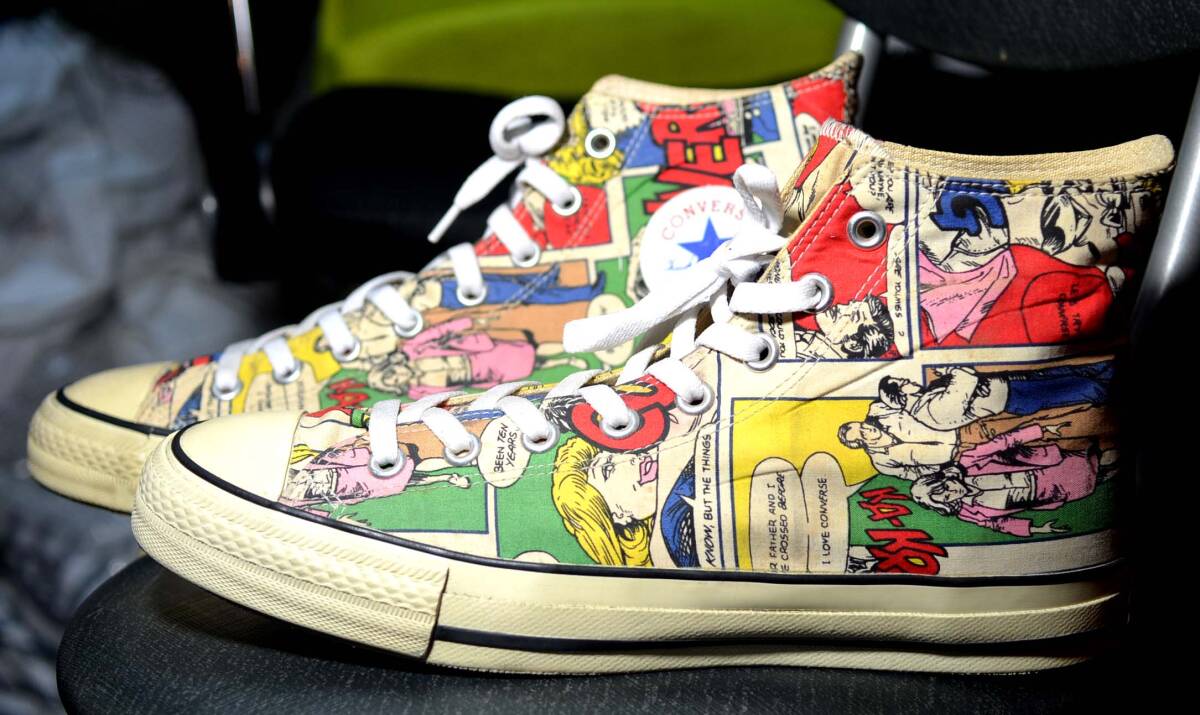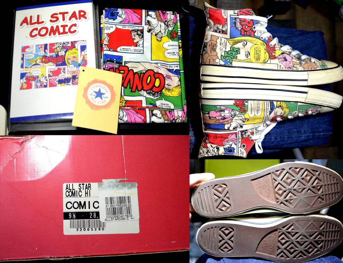 着用は少なく、ソールの減りもほとんどありませんが、経年による黄ばみなどUSED感があります。箱ありますが、へこんでます。付属のバンダナは未使用です。発売当時、大人気を博したアメコミ柄のオールスターです。古いものですので、ご理解のある方に。