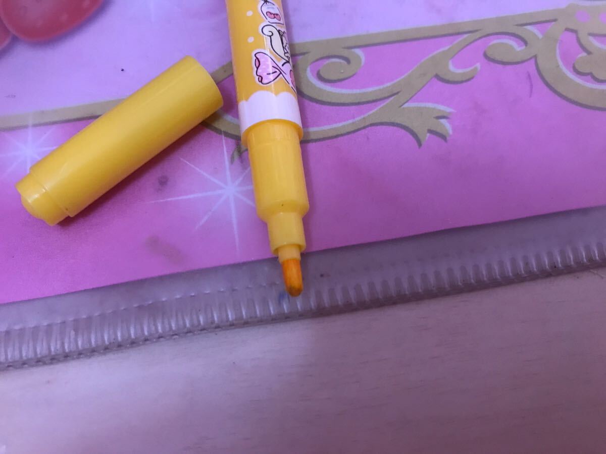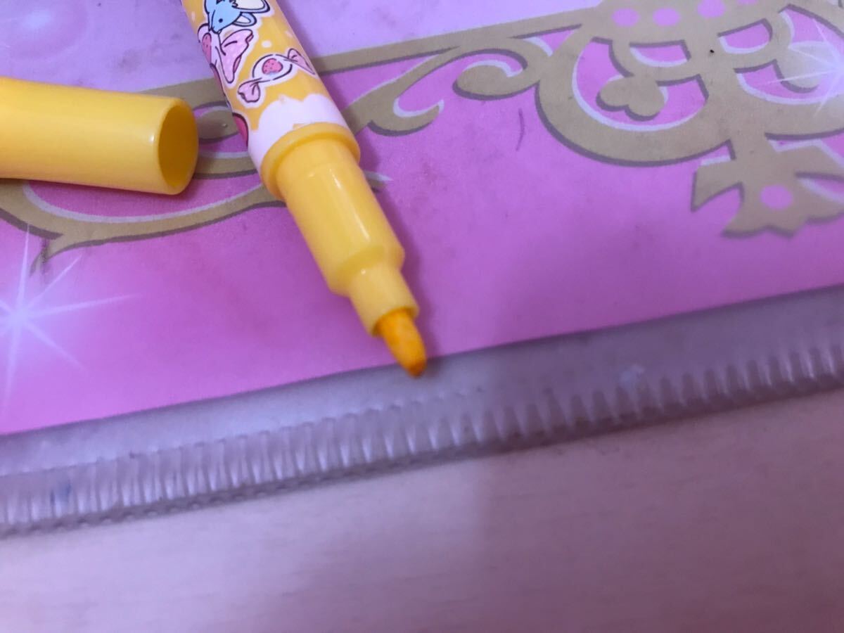 黄色ペンの方のみ太字色薄くなってます緑の方はかおりつきインク残量画像