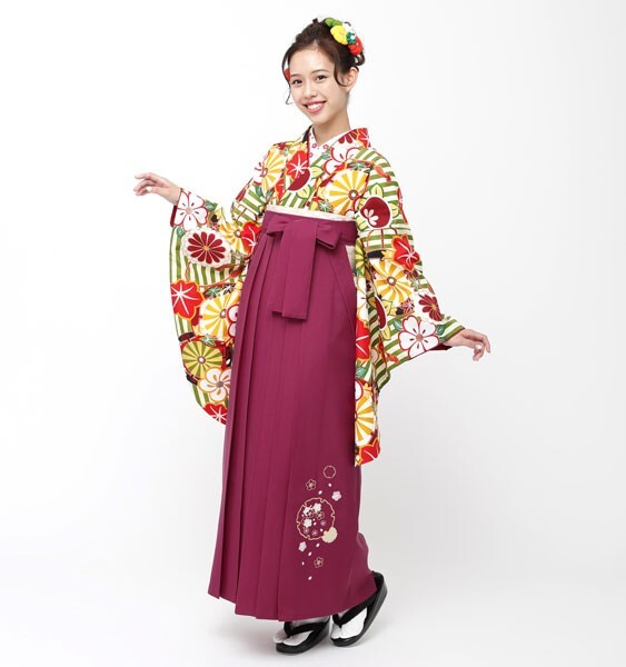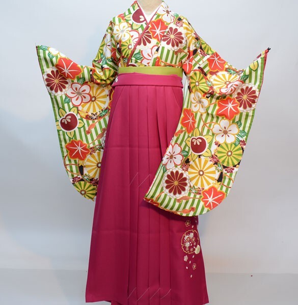 | サイズ | ★着物は丈の短い袴専用着物です。 そのため、丈をたぐる必要がないので着付けが非常に楽です。 着物:身丈約110cm 袖丈76cm 裄丈68cm 袴:袴下91cm 適合身長約153cm~160cm ※袴サイズを変更することで適合身長を変えることができます。 ◎袴下95cm(適合身長160cm~170cm)に変更可能です。 ◎袴下87cm(適合身長145cm~153cm)に変更可能です。 ※ご変更をご要望のお客様は、「フォーム備考欄」「メール(aji_net@khaki.plala.or.jp)」「お電話」「FAX」いずれかの方法でご連絡ください ※上記適合サイズ外の場合でも御相談承ります。 |