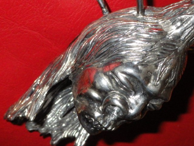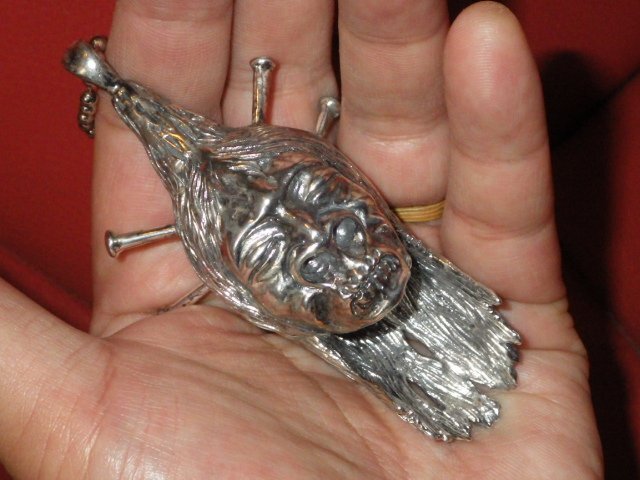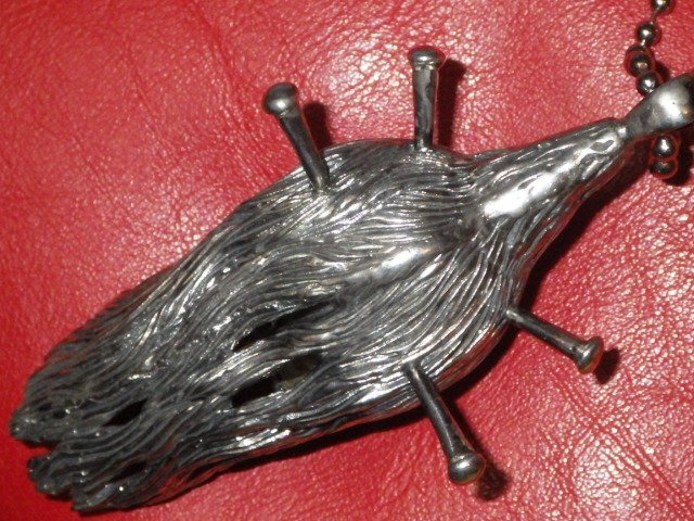 オーストラリア製、サイズはチェーンを除いた本体のサイズで、上部の輪から髪の毛までの高さ:9.7cm、後頭部に刺さったピンからピンまでの横幅:5.0cm、鼻先から後頭部のピンまでの奥行き:4.2cmくらいと大きめでパンチの効いたサイズ感です♪