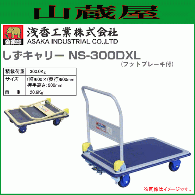 | (積載面寸法) ・全長:900mm×全幅:600mm(ハンドル部含む) ・積載荷重:300kg ・車輪径:130mm ・積載面までの高さ:210mm | ![]()