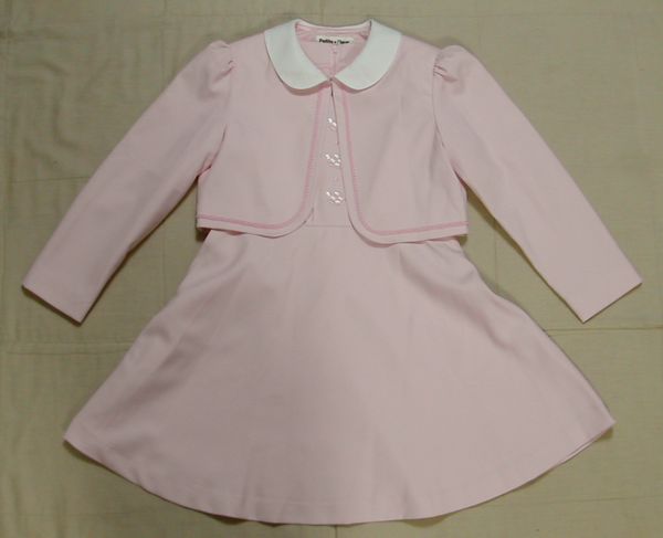 淡いピンクのサラサラ素材でボレロのように丈の短いジャケットとワンピースの可愛いスーツです。
