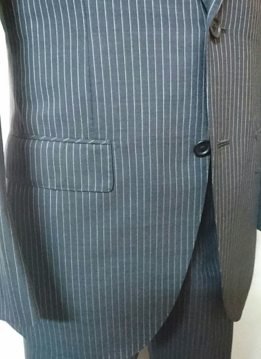 【HAND MADE】…一般的量産品とは違い、型紙・芯据え・中間でのクセ取り工程・立体的衿作りなどの手作業、手間を必要とする量産ラインでは省略される工程を、取り入れたモノ作りにこだわった商品です。 サイズ⇒A5(胸囲92、ウエスト80、身長170) ジャケット⇒着丈74cm、肩幅45cm、袖丈59.5cm、身幅50cm パンツ⇒ウエスト80cm、ワタリ幅32cm、裾幅20.5cm、股下92cm ※本来のナロースーツのような極端な細身ではなく、幅広い年齢層の方に着て頂けるつくりになっております。 色・柄⇒グレー、ストライプ 表地⇒毛100% 裏地(背抜き)⇒キュプラ57%、ポリエステル43% 袖裏⇒キュプラ100% ベント⇒センターベント ステッチ⇒入り 袖ボタン⇒4個、キッスボタン、本切羽 タック⇒ノータック 商品状態⇒新品 着用季節⇒春夏 R1001428 |