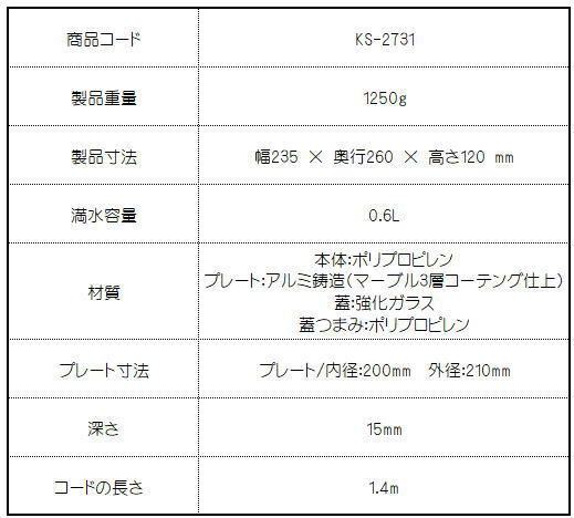 ●材質:本体:ポリプロピレン プレート:アルミ鋳造(マーブル3層コーテング仕上) 蓋:強化ガラス 蓋つまみ:ポリプロピレン