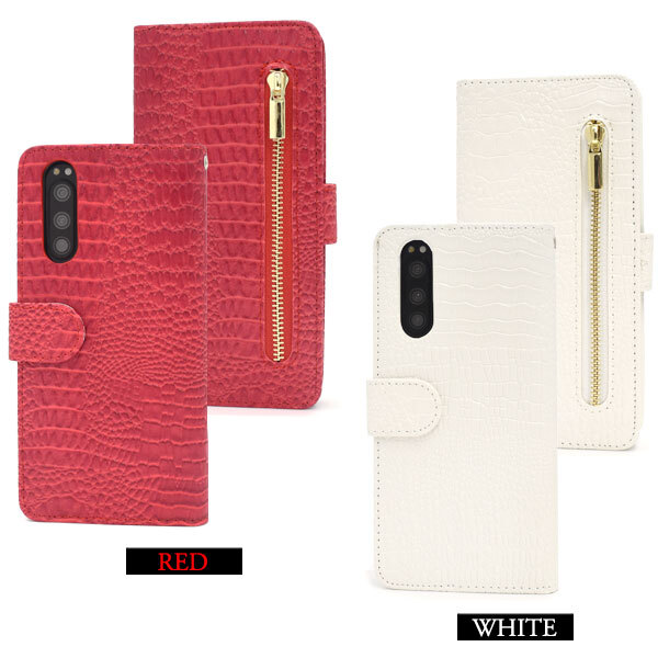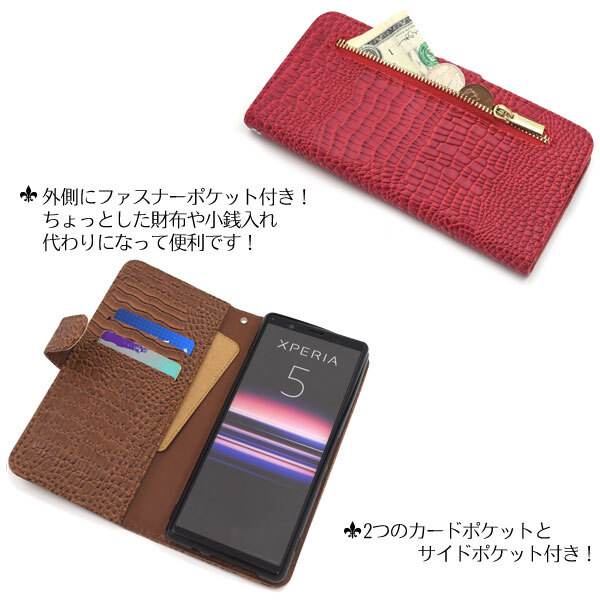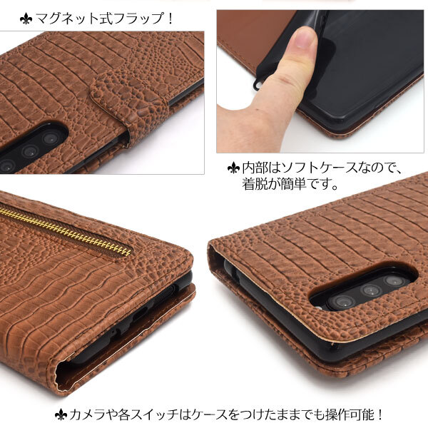 新品■Xperia5 SO-01M SOV41 901SO用クロコダイルレザー調デザイン財布型スマホ・ファスナー付