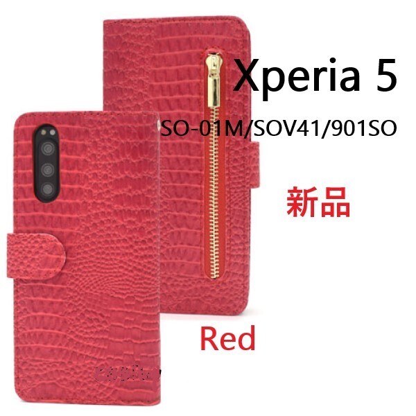 新品■Xperia5 SO-01M SOV41 901SO用クロコダイルレザー調財布型スマホケース(レッド)・Xperia 5 SO01M so-01m so01m sov41 901so DUM