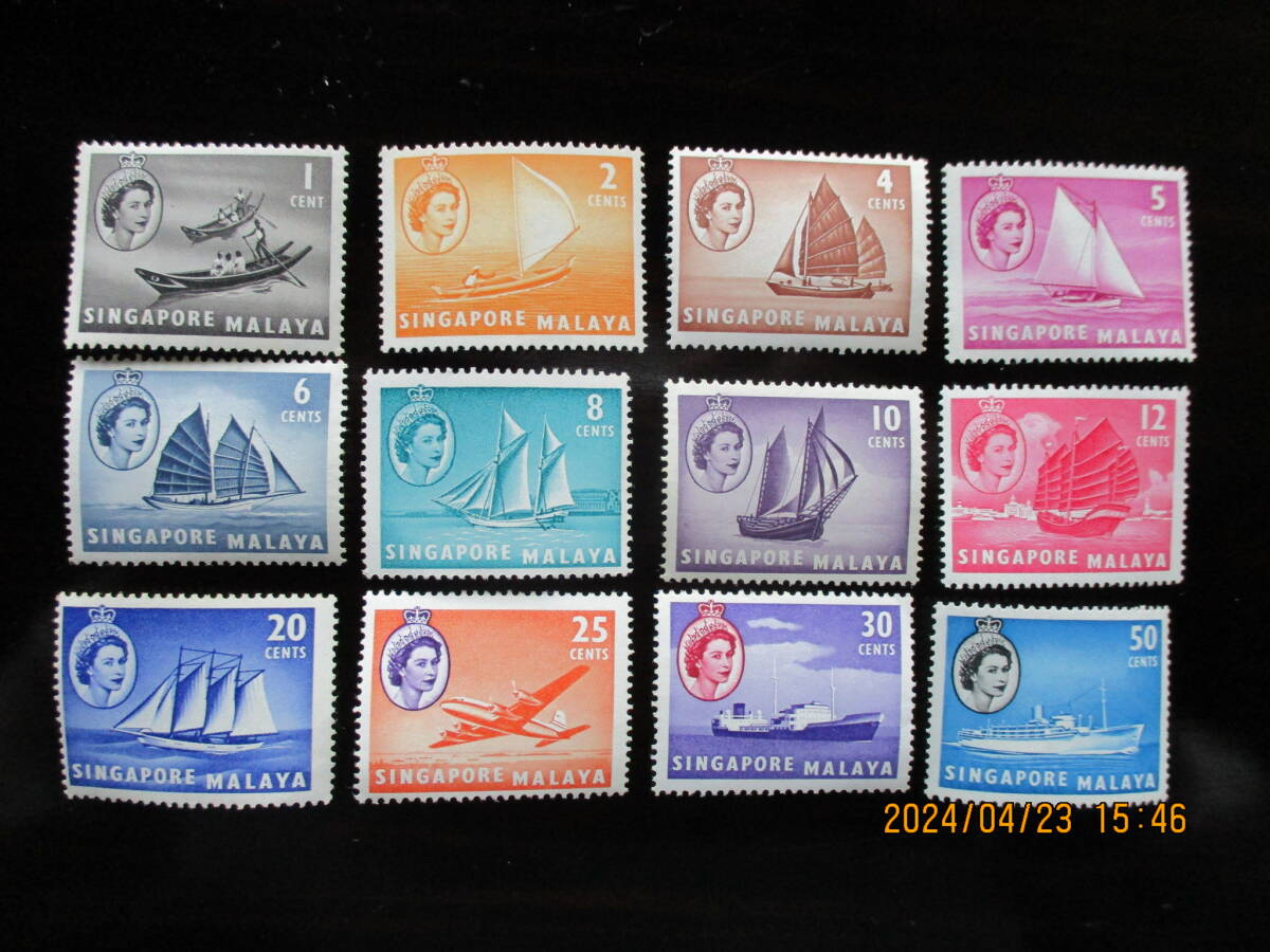 経年の品です。目打ちに多少の日焼けが散見されますが、グラビアの格調高いデザインの切手、この12種のほか1$ラッフルズの銅像、2$シンガポール河、3$シンガポールの紋章の図案で発行されていて15種完のセットです。高額切手はサイズが大きく、市場ではこの運輸図案のみのセットがポピュラーです。 1c;タイトルに同じ 2c;マラヤのコレック 4c;トワコウ 5c;ロンボクスループ 6c;トレンガヌ―ピナス 8c;パラリ 10c;テインバートンコン 12c;トレイダー 20c;ココスキーリングスクナー 25c;アルゴノート機 30c;オイルタンカー 50c;客船チューサン号