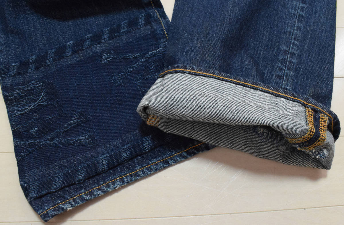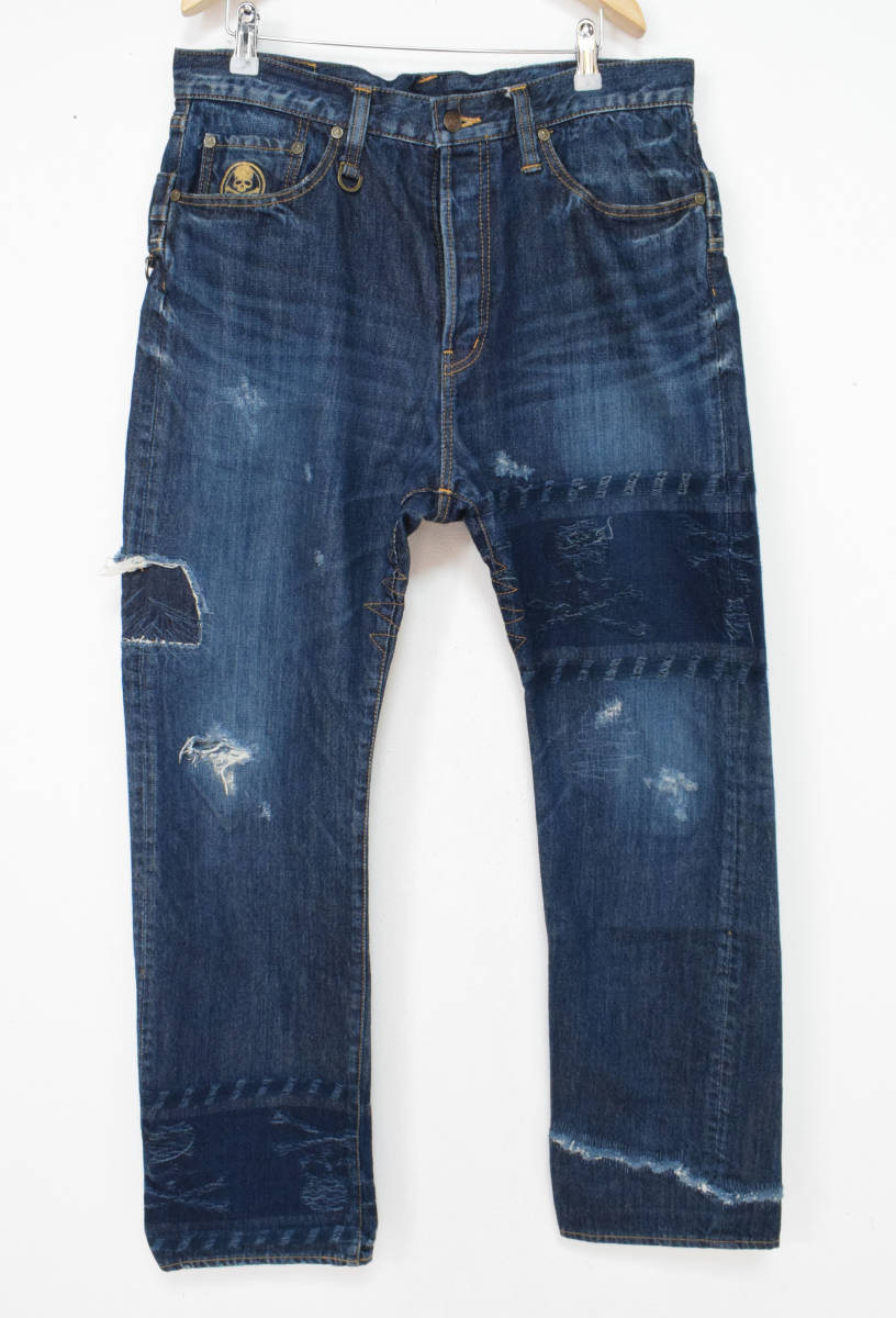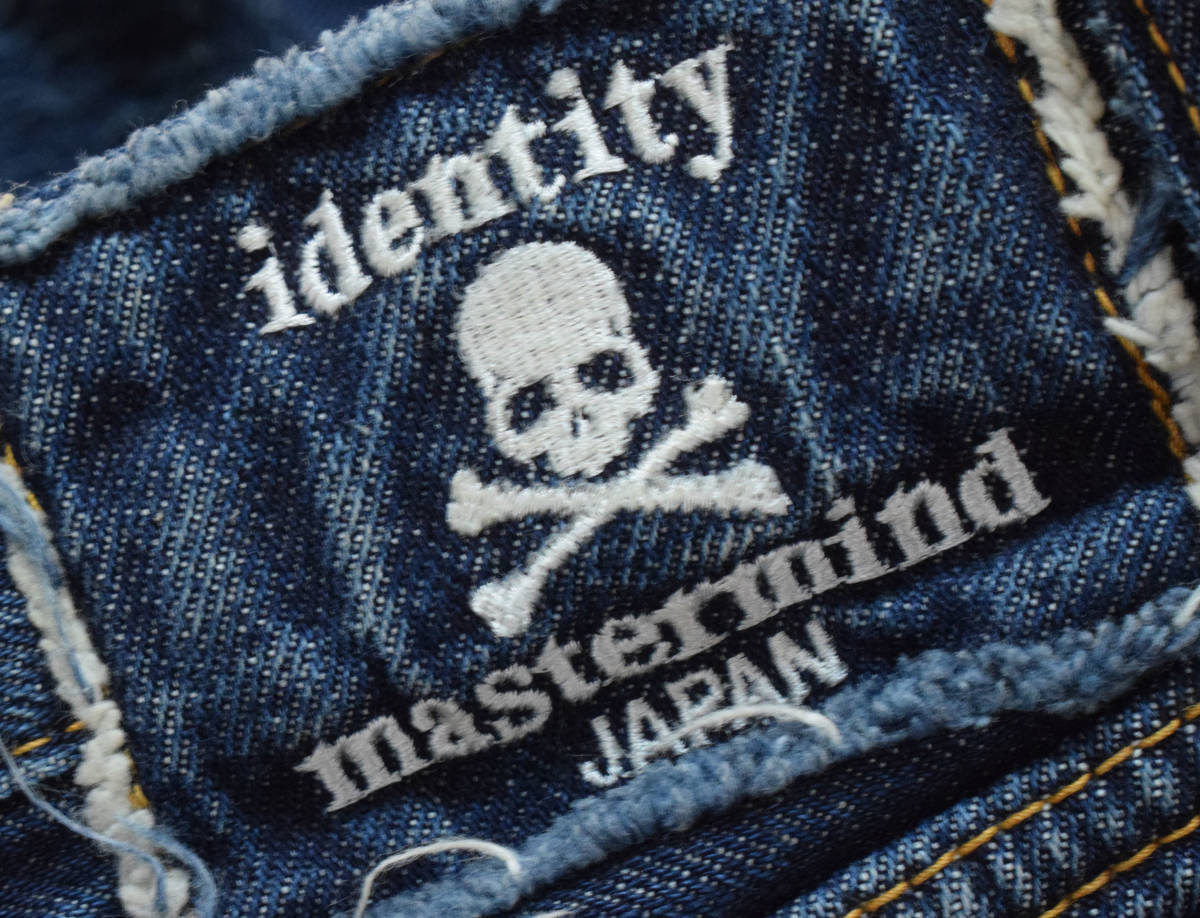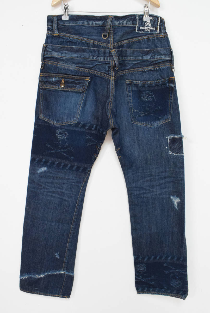 本物 名作 mastermind JAPAN マスターマインド ダブルウエスト スカル ジャガード ダメージ加工 刺繍 デニムパンツ M